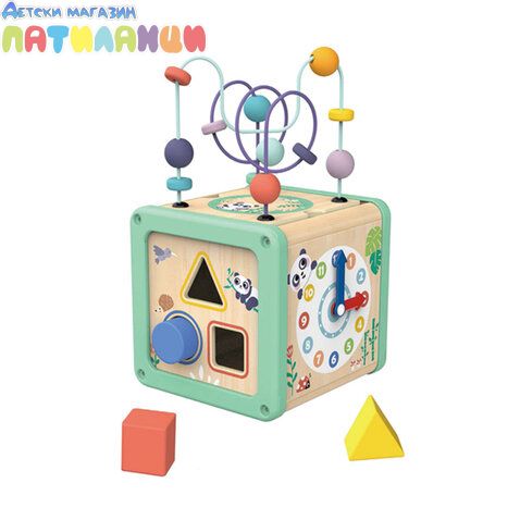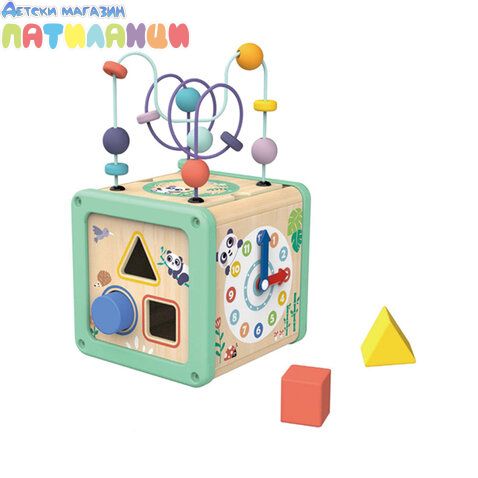 Дървен активен куб Panda предлага четири различни страни за забавление и учене. Има сортер, низанка, зъбни колела и часовник с подвижни стрелки.