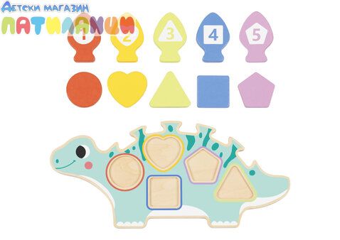 Забавен и цветен, дървен сортер пъзел Dinosaur във формата на динозавър съчетава игра и учене. Детето може да подрежда различни геометрични фигури и да брои елементите на гърба на динозавърчето. Подходящ е за деца на възраст 18+ месеца.