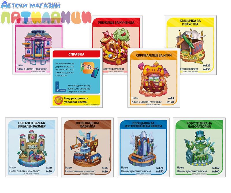 Играй като класическото Монополи – избери банкова карта и съответния пул, придвижвай се по дъската с чудати имоти, купувай, участвай на търгове и събирай наеми чрез приложението;