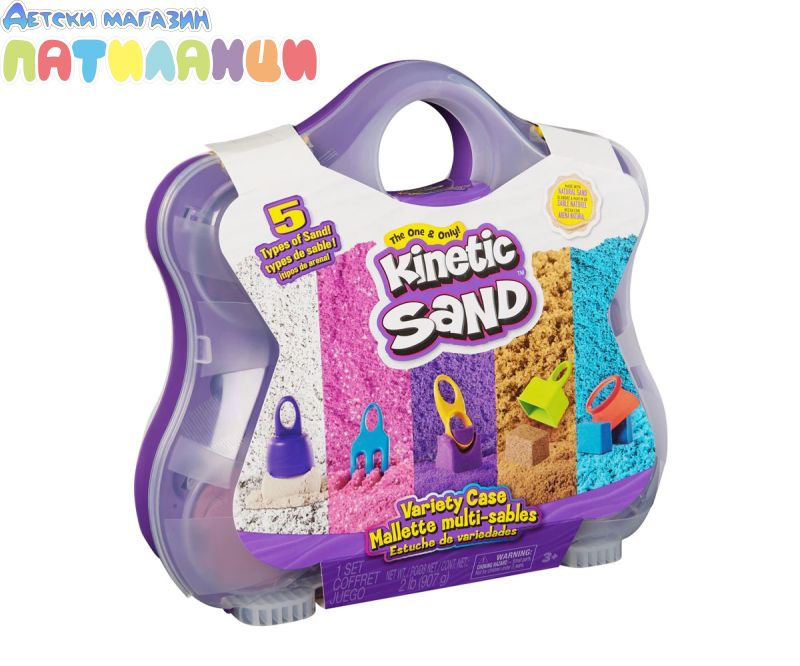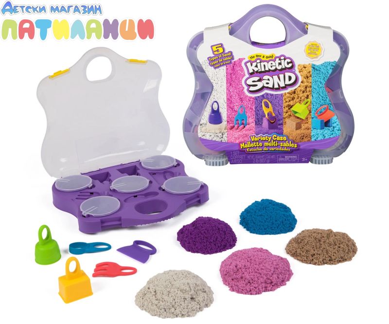 Оригиналният пясък, който е толкова странно задоволителен, че не можете да го оставите! Направен от естествен пясък, Kinetic Sand магически се слепва и никога не изсъхва. Така че можете да създадете отново, и отново, и отново! Моделиране и 3 цвята неонов пясък (лилав, син и бял), блестящ розов пясък и плажен пясък с 5 инструмента за най-доброто изживяване с кинетичен пясък! Използвайте оценените инструменти, подобрете пясъка и разпалете безкрайната креативност – режете, мачкайте, издълбавайте, формовайте и смесвайте! Насърчава игра с преструвки и развива фините двигателни умения. В сензорната кутия откривате вградени отделения с капаци за пясък и места за слагане на инструментите. Опаковайте лесно за съхранение! Оригиналният вълшебен движещ се пясък за игра, който децата обичат! Толкова задоволителен на допир и магически се слепва за лесно почистване. Изработен от естествен пясък и никога не изсъхва, така че децата да могат да играят отново и отново!