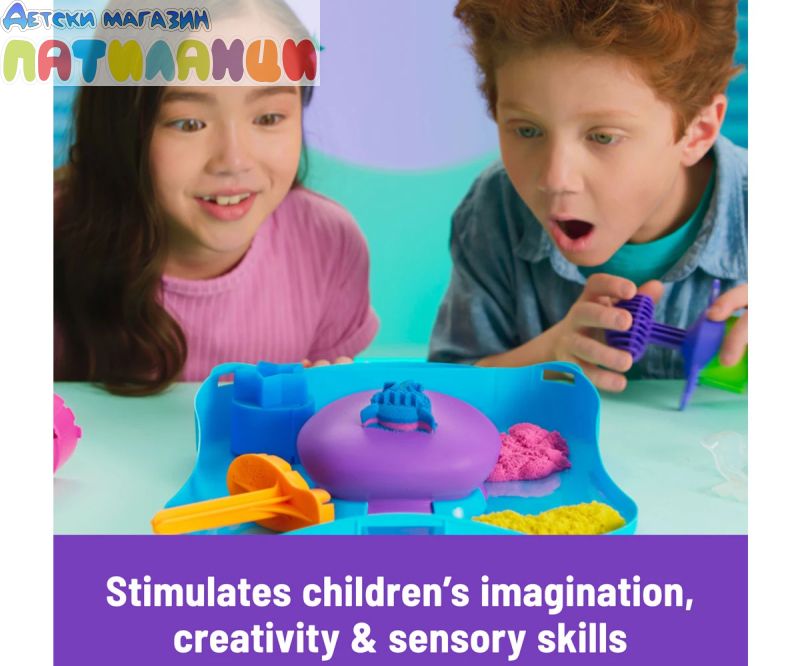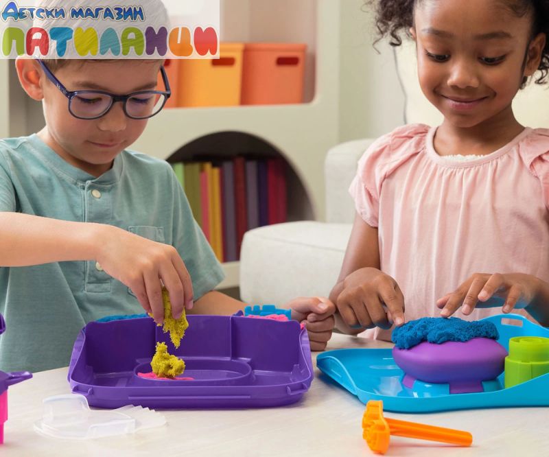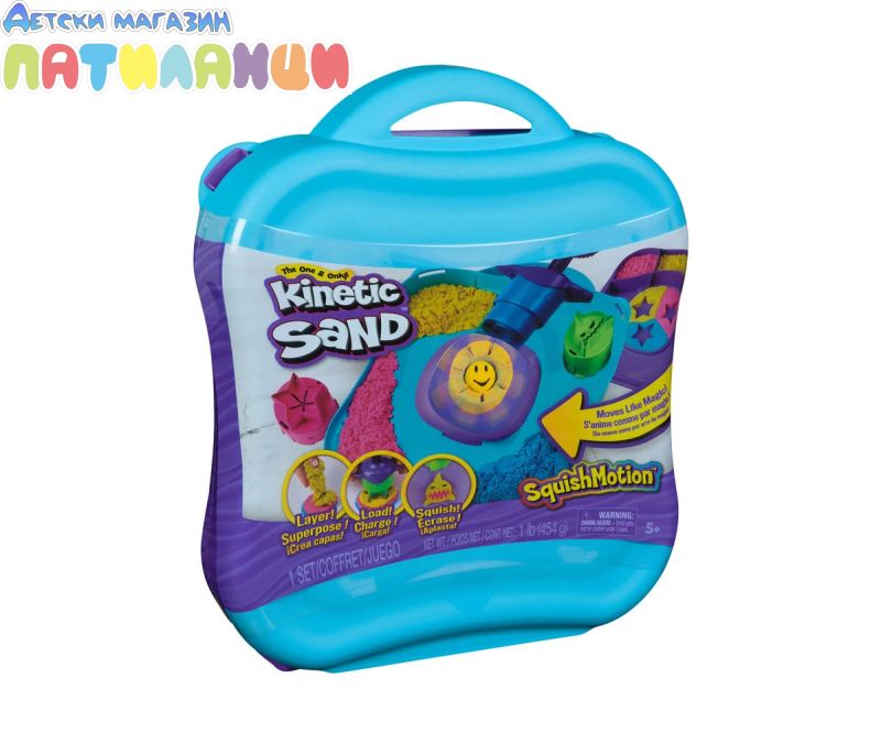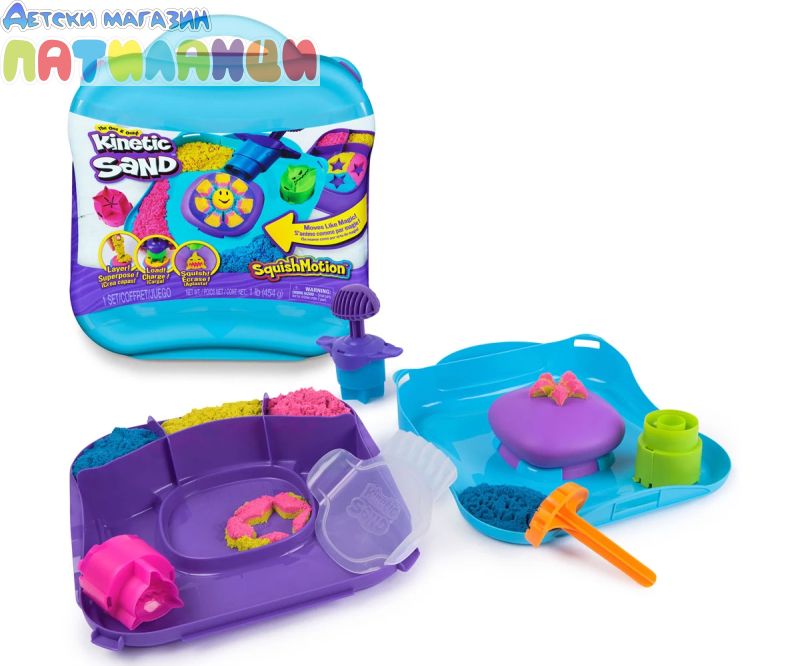 Оригиналният пясък, който е толкова странно задоволителен, че не можете да го оставите! Направен от естествен пясък, Kinetic Sand магически се слепва и никога не изсъхва. Така че можете да създадете отново, и отново, и отново! Вдъхновете живота на креативността с комплекта за игра Kinetic Sand SquishMotion! Този комплект с кинетичен пясък ще разпали въображението и вълнението, докато децата мачкат, за да разкрият своите хипнотизиращи пясъчни творения върху движещото се пространство за игра! Изобразете розов, жълт и син кинетичен пясък вътре в кутията, изравнете с ножа и заредете акулата, слънцето или звездата върху вашия инструмент за щамповане. Натиснете и мачкайте върху пясъчното пространство и наблюдавайте движението на вашите творения – акулата на хрупка, слънчевото кълбо и звездата избухва! Преливайте, разбърквайте и наслоявайте директно върху пространството за мачкане, нарязвайте с резачката и използвайте щампа за по-безкрайна игра. Изкуствата са безкрайни! Единственият кинетичен пясък е направен от естествен пясък, който се залепва за лесно почистване! Създавайте отново и отново – толкова евайки удовлетворяващо, че няма да можете да се откажете от него! Кинетичният пясък е фината моторика и креативността чрез независима тактилна игра. Изживейте магията във всяко разкриване с Kinetic Sand SquishMotion!