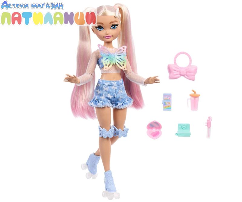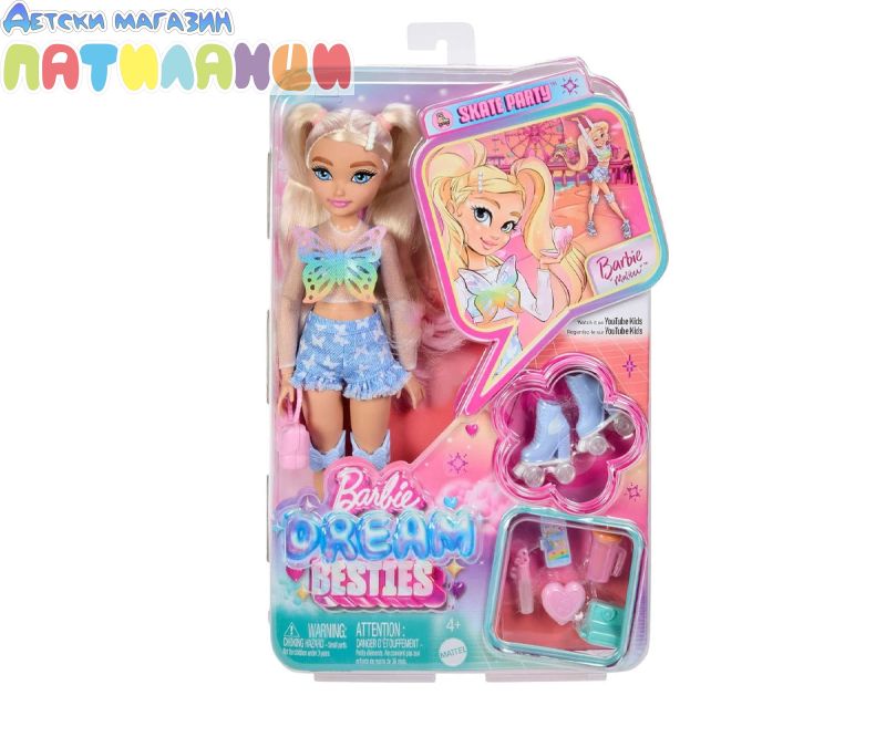 Куклите Barbie Dream Besties идват със забавни, тематични аксесоари, които подхождат към новото хоби на Барби – ролерите! Вижте Барби 'Малибу' в нови дрехи, вдъхновени от пеперуди, които пасват на нейните ролери. Барби 'Малибу' мечтае да има собствена козметична компания! Тя носи винаги тематични аксесоари, като червило и огледало. Барби 'Малибу' включва дълга руса коса за забавление при стилизиране и вдъхновява децата на възраст 4 и повече години да мечтаят и да следват мечтите си. Куклата не може да стои сама. Цветовете и декорациите могат да варират.