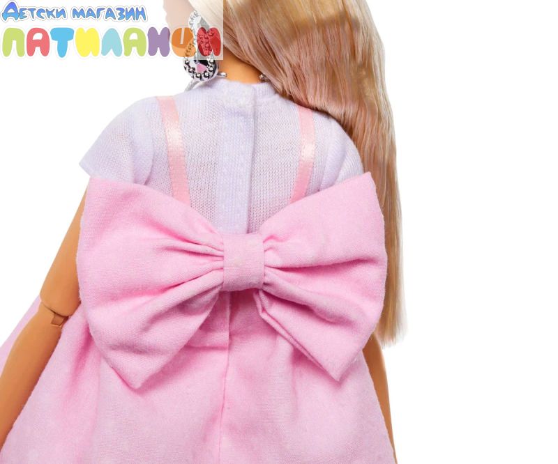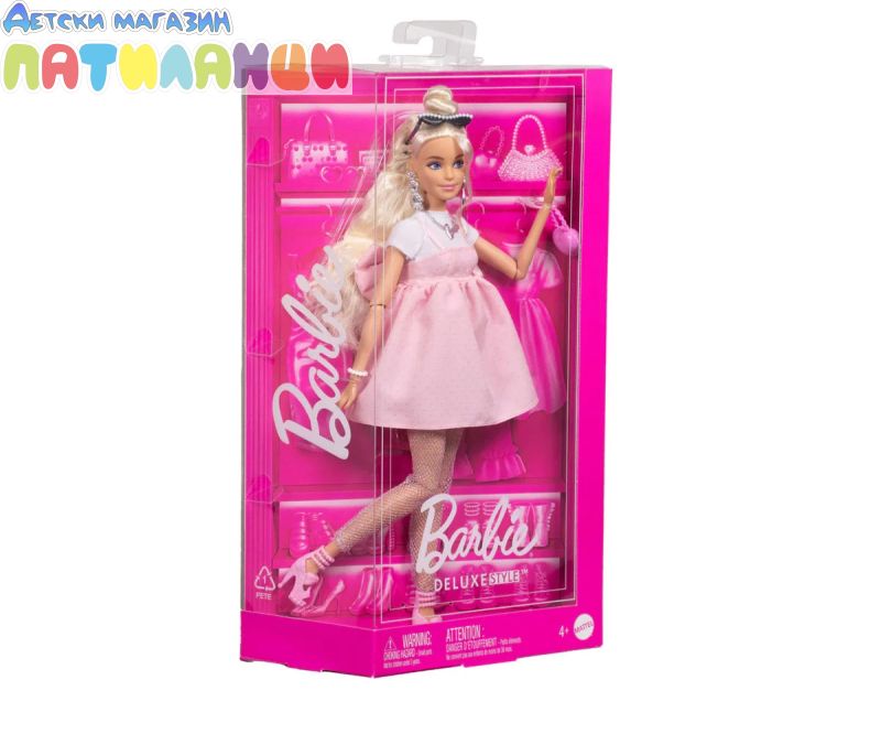 Представяме ви кукли Barbie Deluxe Style! Всяка колекция предлага привлекателни кукли, с изискан аксесоари, вдъхновени от най-новите модни тенденции. Децата и колекционерите ще обичат да стилизират Barbie Deluxe Style за всякакви блестящи поводи... и да ги поставят в поза, достойна за всяка модна сцена! Barbie Deluxe Style куклите издигат модата на ново ниво с красиви облекла и аксесоари от следващото ниво, вдъхновени от естетиката Barbiecore! Никой не прави Barbiecore по-добре от самата Барби. Облечена в характерно Barbie розово, тази кукла има вълниста руса коса, стилизирана в половин кок! Тя пресъздава Barbiecore с пастелна рокля с огромна панделка на гърба, сложена върху бяла тениска. Розови мрежи чорапи добавят още чар към нейния великолепен вид! Куклата Барби съчетава облеклото си с бижута, перлени слънчеви очила, чанта с форма на сърце и обувки с панделки. Подвижните стави позволяват да заема всякакви позиции! Децата на възраст 4 години и нагоре може да събере всички кукли Barbie Deluxe Style, за да вдъхнови още повече модни изследвания и забавление със стилизирането в тази разнообразна линия!