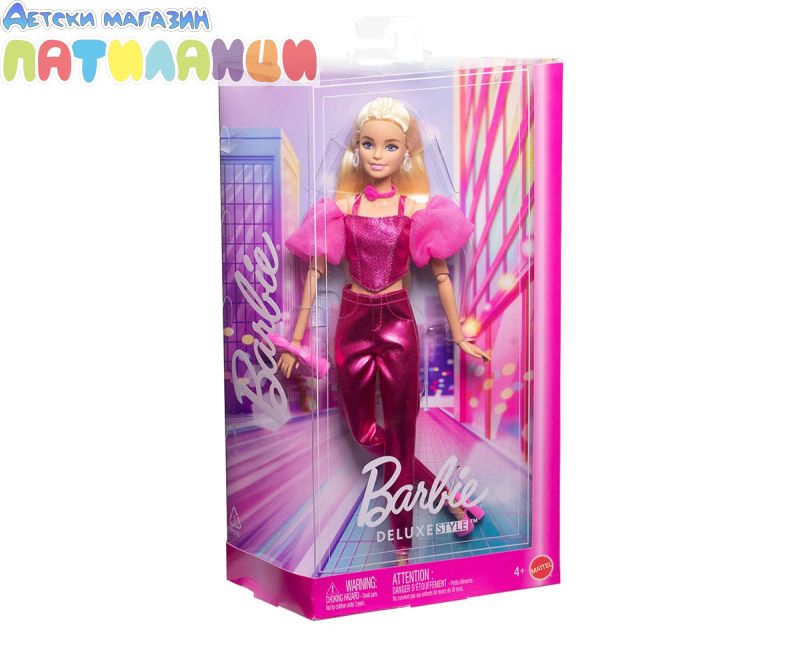 Куклите Barbie Deluxe Style придават очарование на думата „блясък“! Всяка колекция предлага впечатляващи материи, забавни силуети и луксозни аксесоари, вдъхновени от най-актуалните модни тенденции. Децата и колекционерите ще се влюбят в стилизирането на куклите Barbie Deluxe Style за всички бляскави поводи… и ще ги позират в стойки, достойни за модно дефиле! Всяка кукла се продава отделно, в зависимост от наличността. Куклите не могат да стоят самостоятелно. Цветовете и декорациите могат да варират. Тази Барби блести в розово от глава до пети! Нейният блестящ металически корсет се допълва от нежни органзени ръкави, които „плават“ над раменете ì. Подходящите панталони подчертават елегантния ì вид, а полу-сплетената прическа разкрива големите ì обеци и огърлица с рози. Барби носи и различни гривни, чанта с панделка и розови обувки на ток. Гъвкавите стави позволяват куклата да заема всякакви позиции. Децата над 4 години могат да съберат всички кукли от серията Barbie Deluxe Style, за да експериментират с модата и да се забавляват с тази разнообразна колекция.