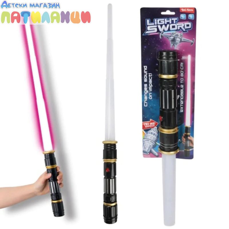 Меч за страховити битки и смели подвизи! Свети, издава звук при попадение и може да се удължи до 80 см!