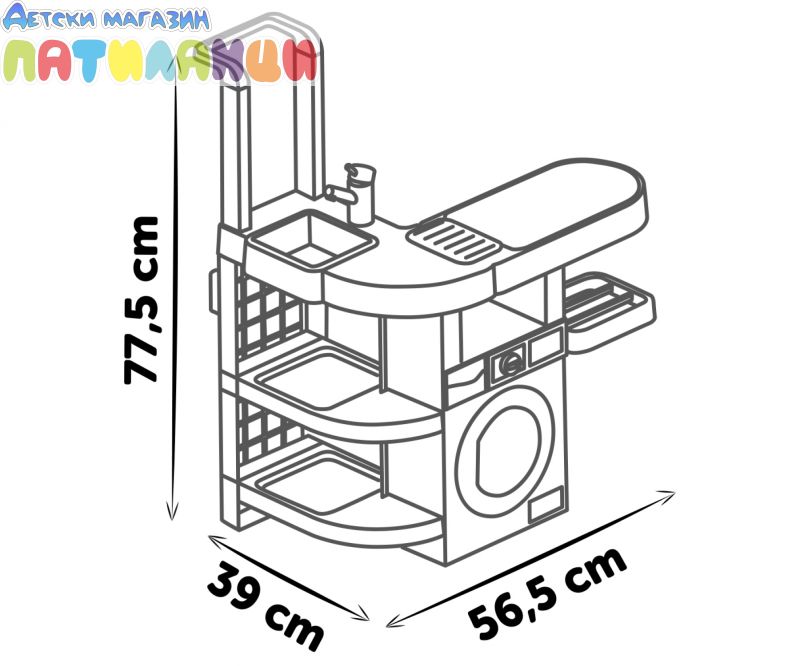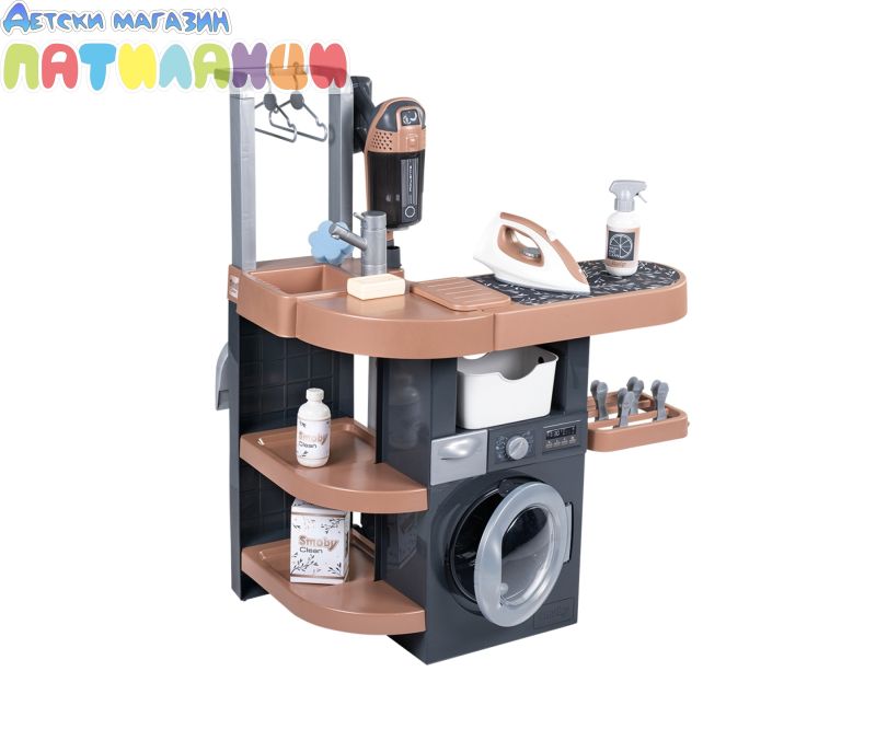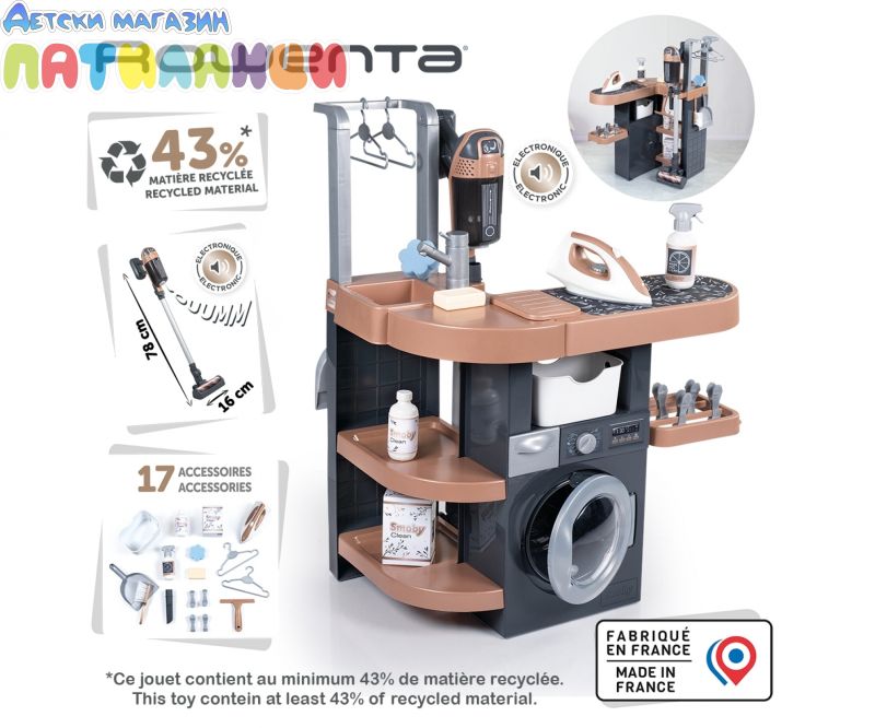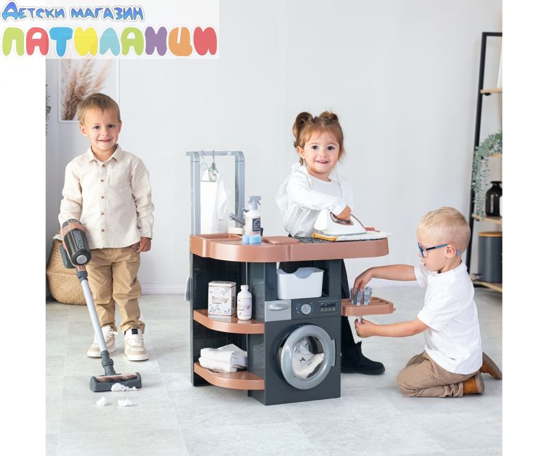 Впуснете се в света на домашните задължения с играчка, която комбинира пералня, мивка, сушилник и ютия — всичко, което едно малко домакинство може да пожелае! Цялата тази “къща за пране” е събрана в компактна и стилна конструкция, готова да вдъхнови часове игра и учене.