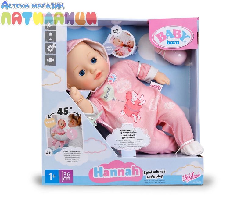 Baby Born® Кукла Хана – първата интерактивна кукла за най-малките. Готови ли сте за първата грижовна игра? Създадена специално за малките ръчички, кукла Хана е мека, интерактивна кукла с реалистични звуци, която подчертава емоционалната интелигентност и ролевата игра още от ранна възраст.