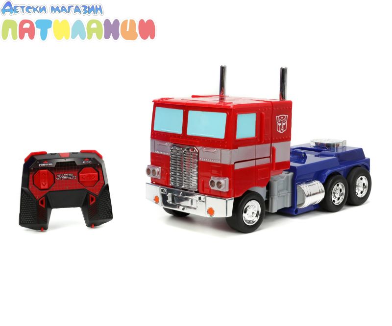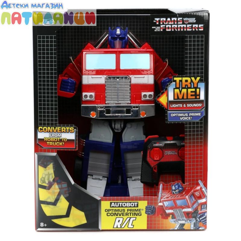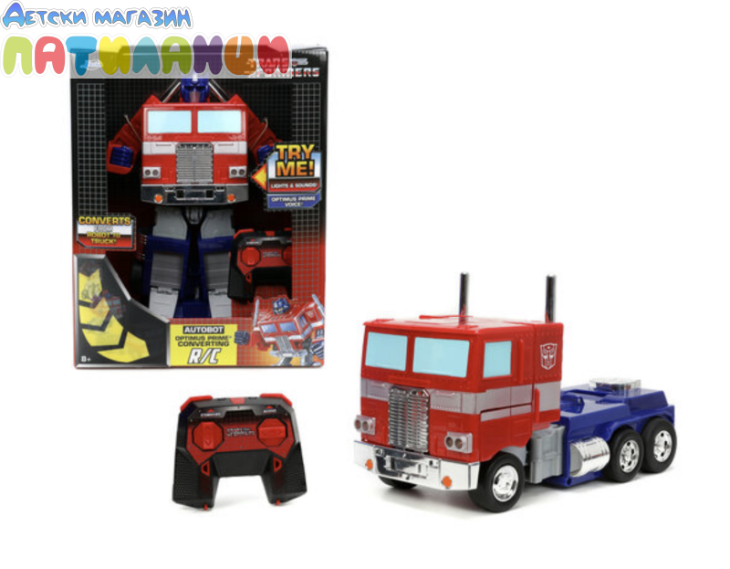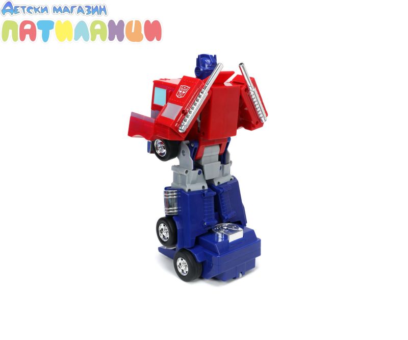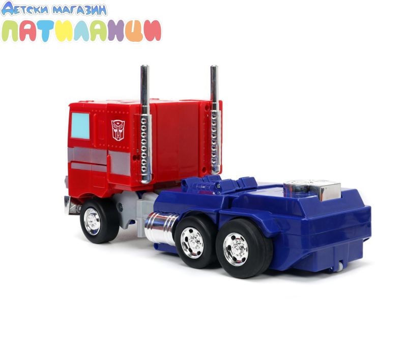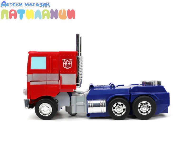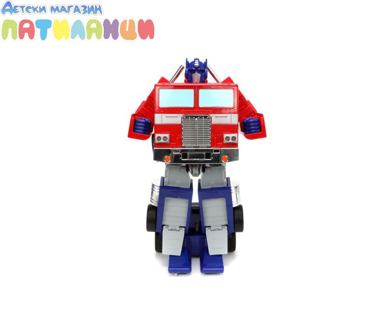 Автоботи, напускайте! Те живеят сред хората, крият се на видно място и ни наблюдават - Трансформърс! С този самотрансформиращ се Оптимус Прайм от Jada Toys, можете да имате герой, живеещ сред вас, оборудван със светлини и звук. Той се трансформира от камион в робот и обратно с натискането на един бутон, така че Оптимус е винаги готов да защити човечеството. Висококачествената изработка и инженерство на тази готина фигурка с дистанционно управление осигуряват плавни движения, докато той се трансформира. С помощта на дистанционното управление, Оптимус Прайм се движи напред, търкаляйки се като камион и като робот, докато в режим на робот симулира ходене, като движи краката си. Класическият дизайн на Оптимус Прайм е базиран на появата му в анимационния филм от 1986 г. "Трансформърс - Битката за Кибертрон". Звуковата функция включва оригиналния глас от филма (на английски). Фигурката се предлага в отворена картонена опаковка с функцията "Опитай ме".