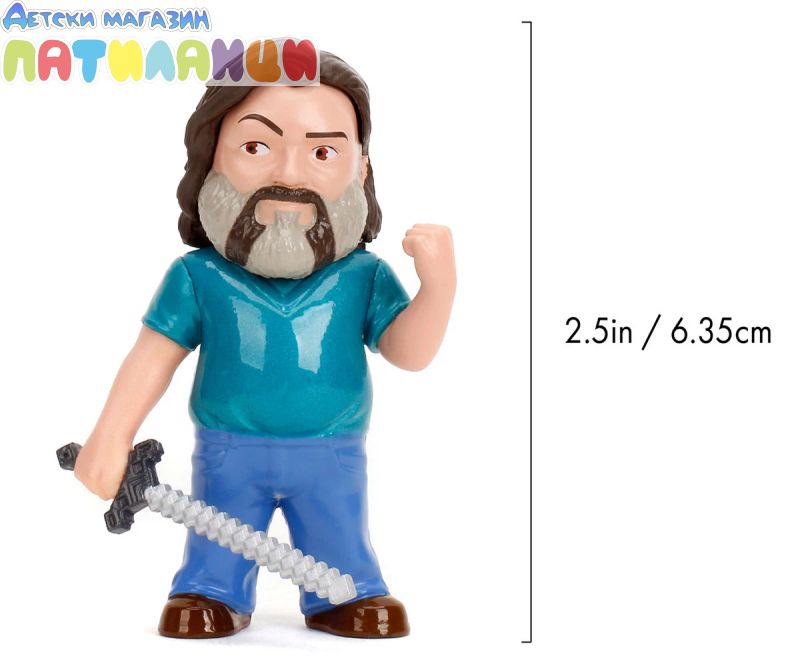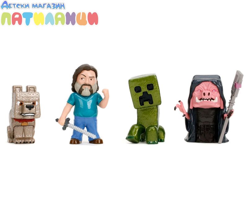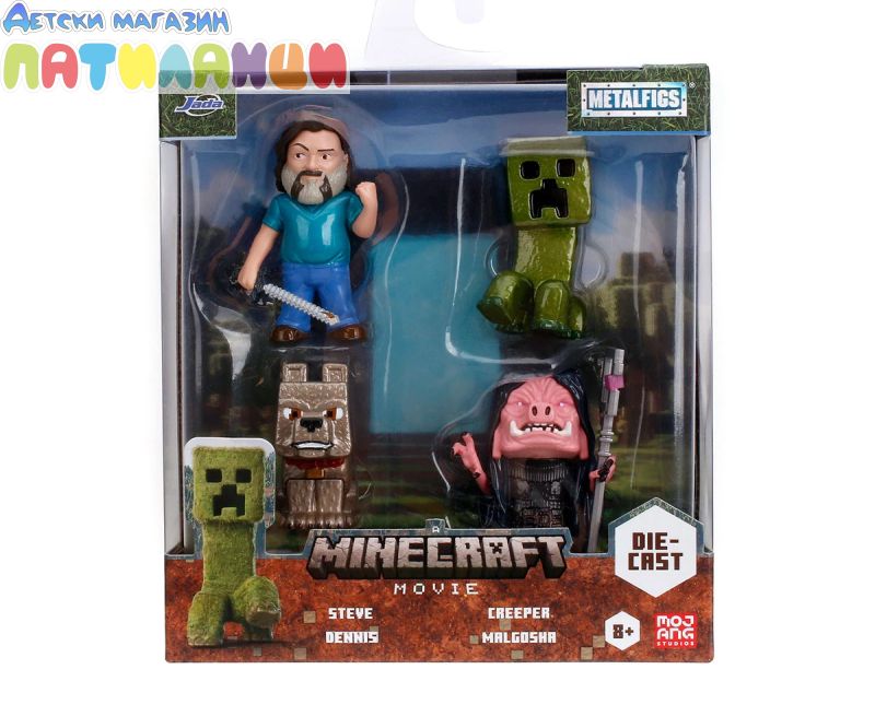 Jada Toys – комплект от 4 фигури от филма Minecraft (Steve, Malgohsa, Dennis, Creeper) – метални колекционерски фигури за фенове и деца над 8 години, височина 6.5 см, вълна 1. Филмови герои от света на Minecraft – вече и за колекционери! Първо Minecraft завладява гейминг света, след големия екран – сега емблематичните пикселни герои от първия филм Minecraft могат да бъдат част от вашата колекция! Всяка от четирите мини фигурки е с детайлен пикселен дизайн, изработена от висококачествен метал.
