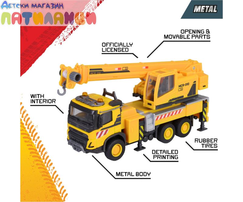 Готови ли сте за наистина трудните задачи? Тогава 22-сантиметровият мобилен кран с автентичен вид на камиона Volvo FMX е точно за децата! Със здравата си метална кабина и телескопичното си рамо, официално лицензираният камион Volvo бързо ще се превърне в централната част на всеки строителен проект. Благодарение на свободния си ход и сцеплението с гумени гуми, играчката кран се движи уверено по строителната площадка и печели точки като строително превозно средство в моделите коли Majorette Grand Series с големия си мащаб, грижливите си детайли и многото функции за игра.