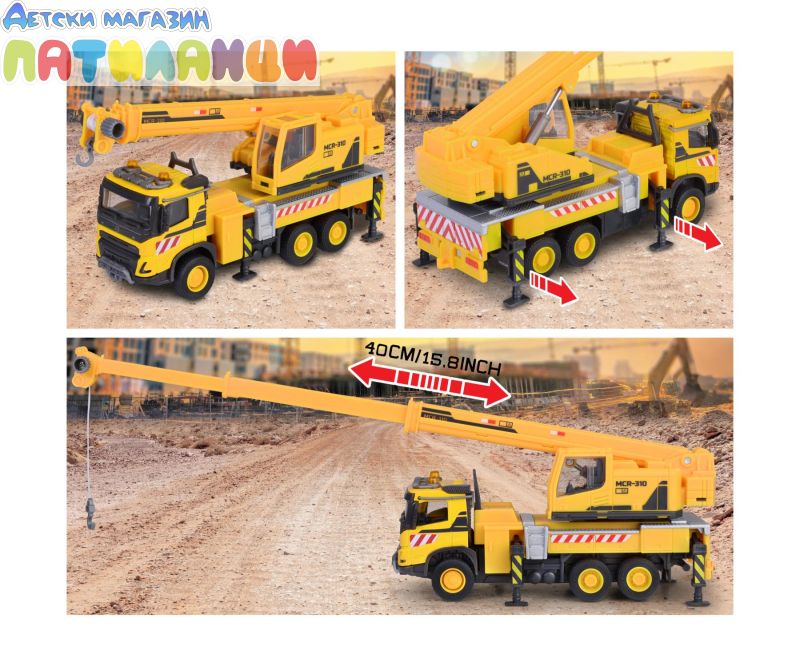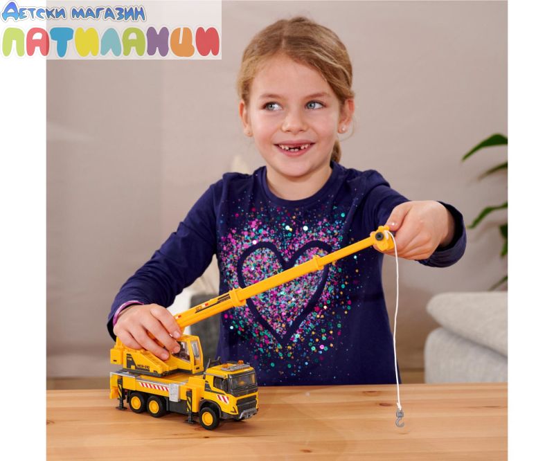 Деца на възраст над 3 години могат да транспортират товара си от едно място на друго, използвайки ръчната лебедка и куката: за целта 3-делното телескопично рамо се удължава до 35 см, а рамото на крана може да се движи гъвкаво във всички посоки. За да се гарантира, че нищо не се обърка по време на товарене, 4-те опорни крака държат голямото строително превозно средство здраво на място. Веднага щом опорите се приберат, детският кран се отправя с бързина към следващата работна площадка – идеално за всички малки строителни работници, които искат да премахнат всяка пречка от пътя си!