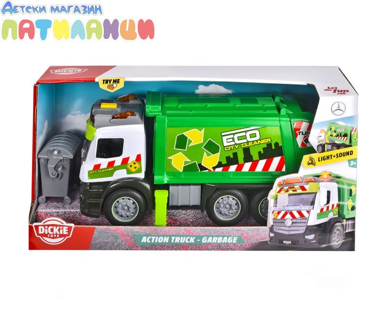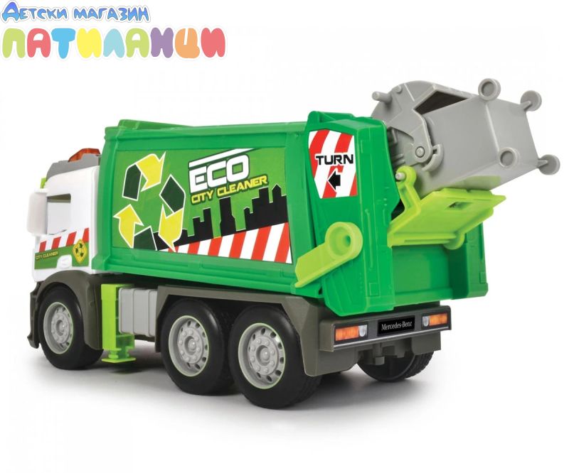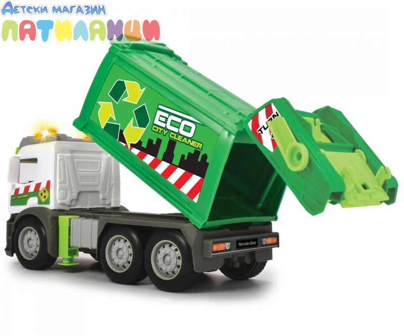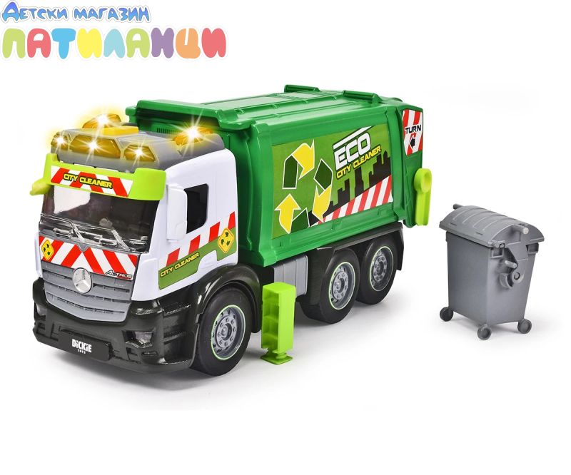Време е за събиране на отпадъците – с реалистичния камион за боклук на Dickie Toys! Малките почитатели на специализирани превозни средства ще бъдат възхитени от този реалистичен модел на камион за отпадъци, вдъхновен от истинските Mercedes Actros камиони. Със своя автентичен дизайн, светлинни и звукови ефекти, подвижни части и функция за повдигане и изсипване на кофа, тази играчка ще превърне всяка игра в истинско приключение!