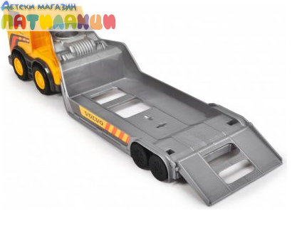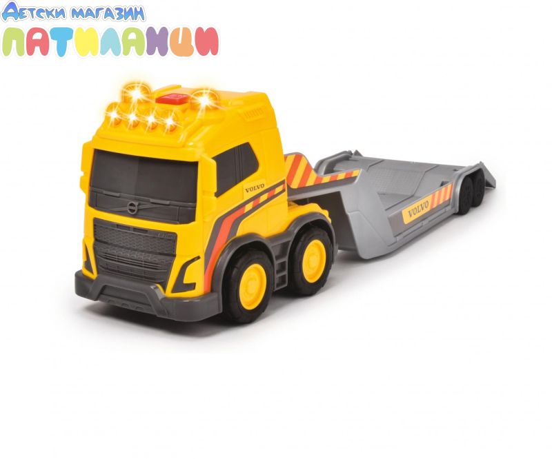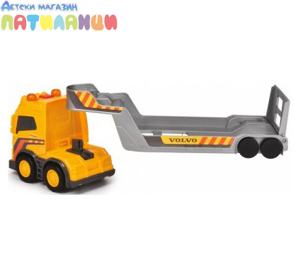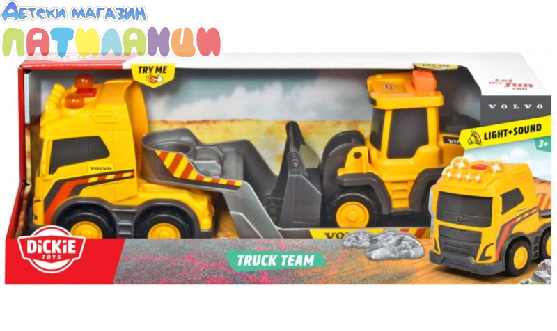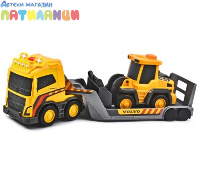 Камионът с дължина 32 см е прикрепен към ремарке, съдържащо челен товарач Volvo (9 см). Челният товарач разполага с въртящи се колела за лесно маневриране, както и с лопата, която може да се движи нагоре и надолу с натискане на бутон. Перфектната играчка за начинаещи млади строителни работници!