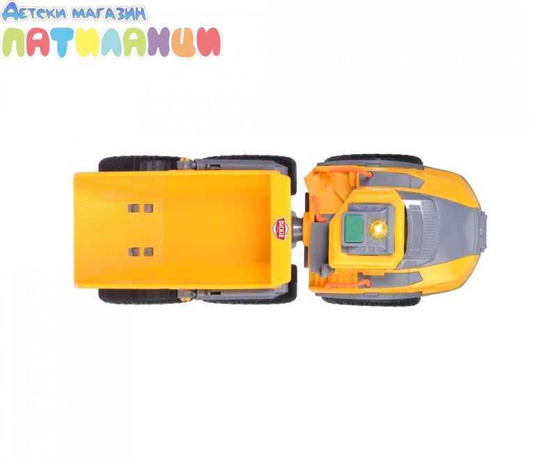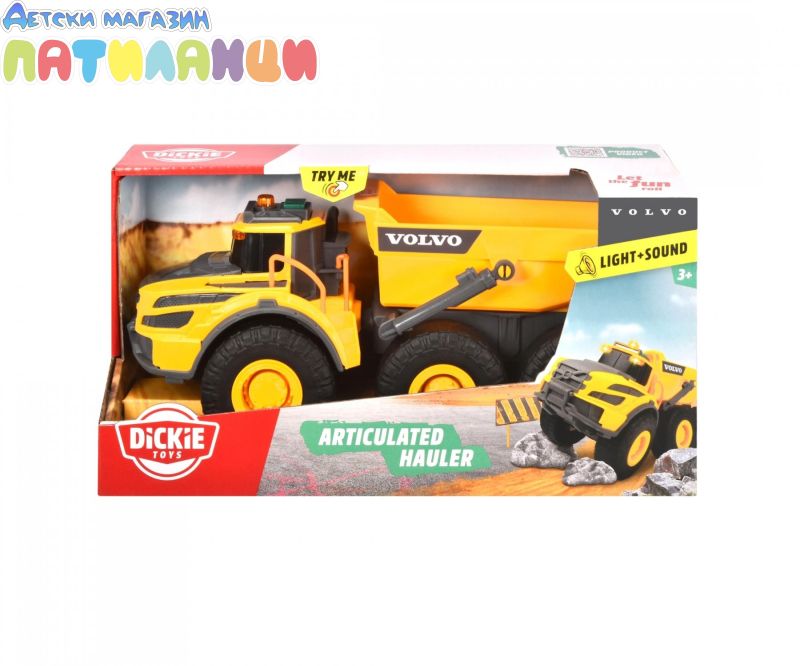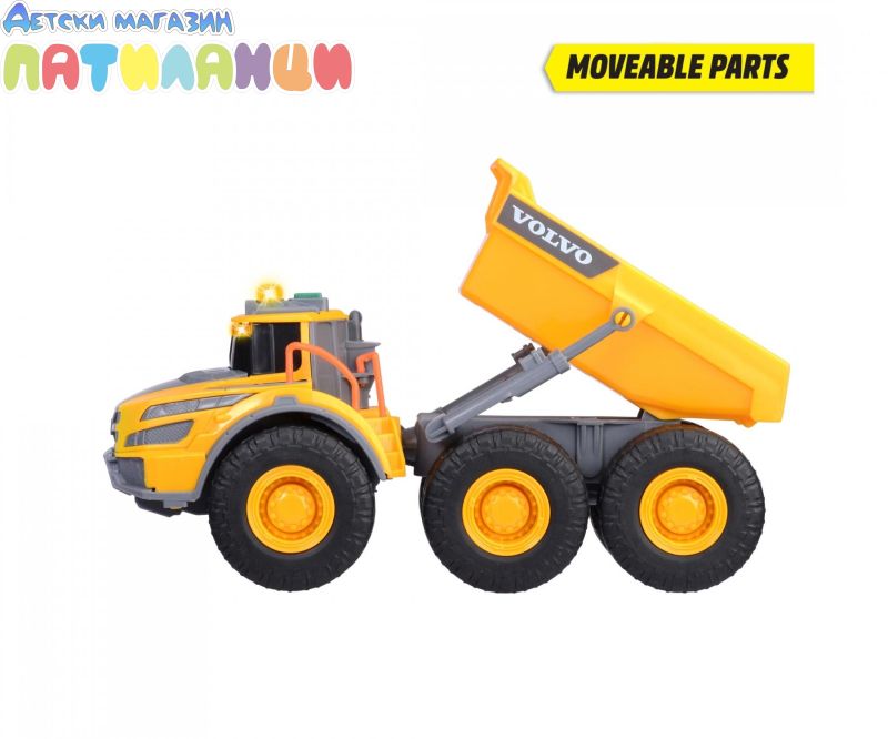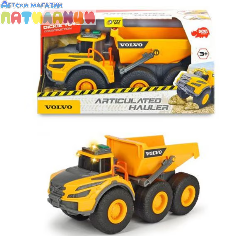 Съчленен самосвал Volvo от Dickie Toys – задължителен аксесоар за всяка строителна площадка за играчки! Съчлененият самосвал е дълъг 23 см и се предлага с маневрена самосвална кутия за транспортиране на строителни отпадъци, камъни и други строителни материали от точка А до точка Б. Точно като истински самосвал, играчката може да се използва и върху неасфалтирани повърхности и разполага с въртящи се колела, както и с теглич зад кабината на водача за преминаване през тесни завои. Съчлененият самосвал е пълен със забавни функции – в допълнение към пъргавия си дизайн, той разполага и с самосвална кутия, която може да се движи нагоре и надолу, точно като истински самосвал, както и светлинни и звукови ефекти (включва 2 батерии 1,5 V AA).