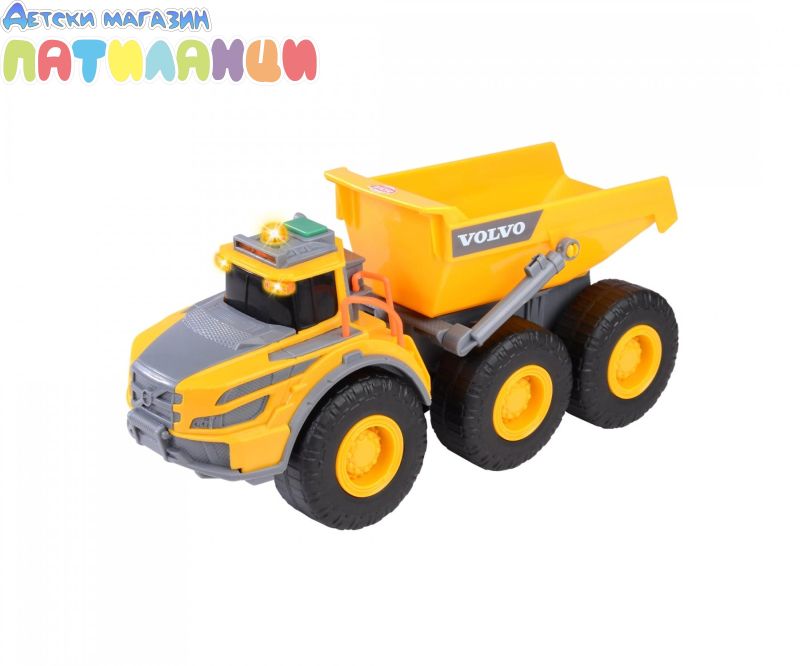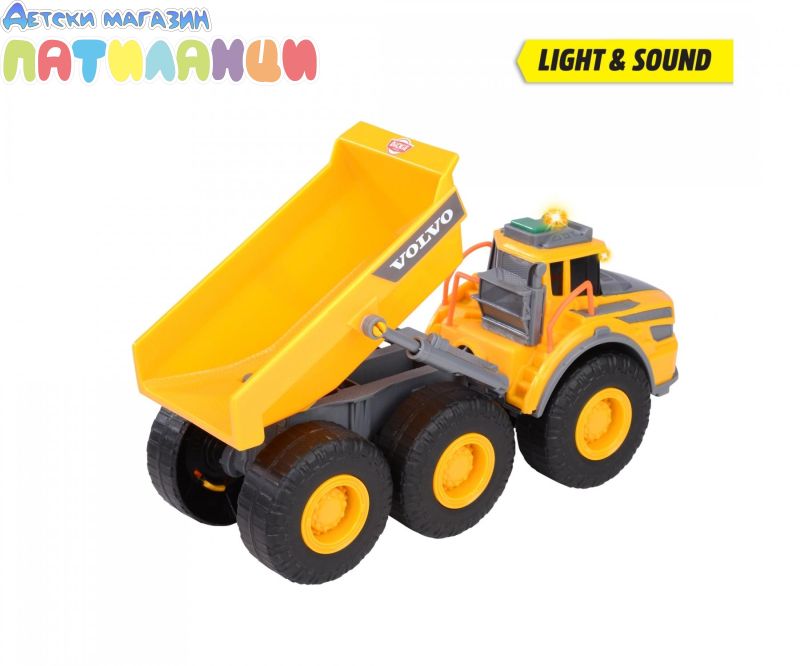Dickie Toys – Съчленен самосвал Volvo – 23 см строителна машина с функция за накланяне, звукови ефекти, светлини, въртящи се колела, строителна машина за деца на 3 и повече години
