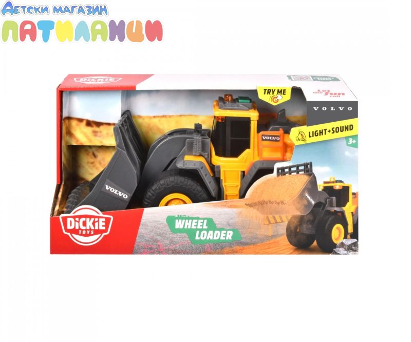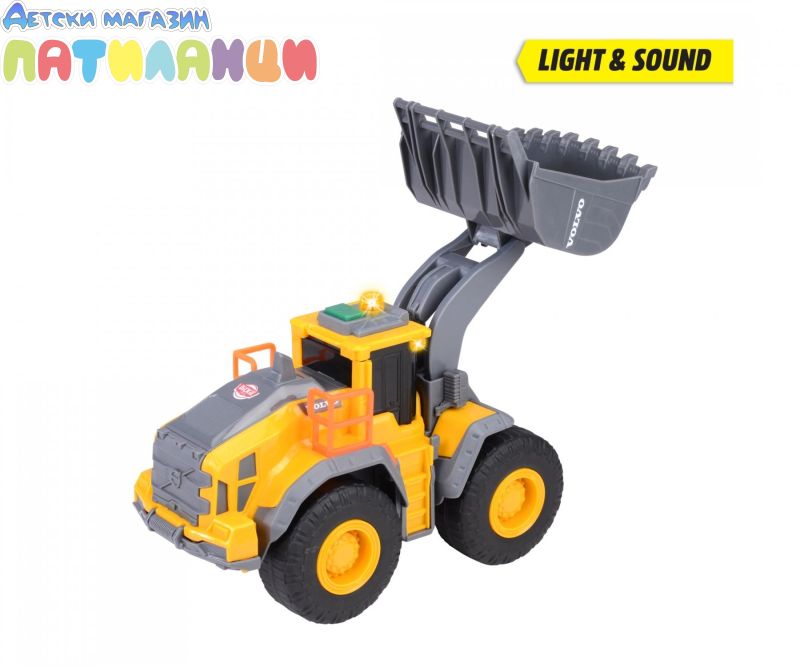 Dickie Toys – Volvo Wheel Loader – 23 см челен товарач с голяма лопата, светлинни и звукови ефекти, конструкторска играчка за деца над 3 години