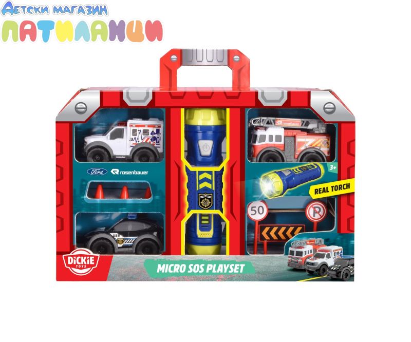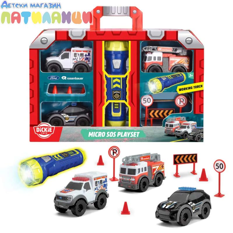 С комплекта за игра Dickie Toys Micro SOS, деца на 3 и повече години могат да се впуснат в вълнуващи спасителни мисии: 3 официално лицензирани модела коли - пожарната кола Rosenbauer Viper, полицейската кола Ford Mustang Mach-E и линейката Ford F450 - чакат да бъдат разположени. Всяка количка е с дължина приблизително 8 см, има детайлен дизайн и е оборудвана със свободен ход. Включените пътни знаци и конуси осигуряват още повече забавление по време на игра и могат да се използват за създаване и разиграване на вълнуващи сценарии за детските коли - от местопроизшествия до полицейски пътни блокади.