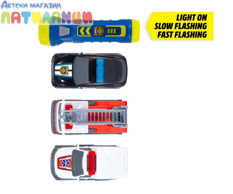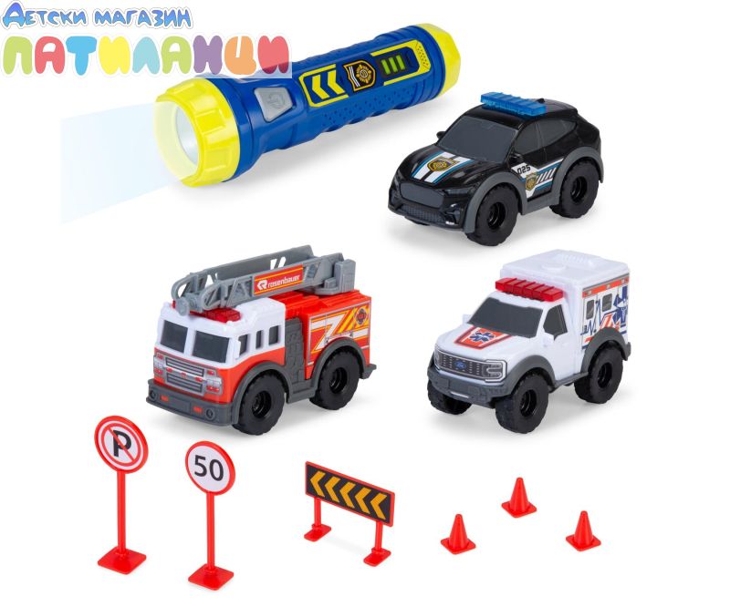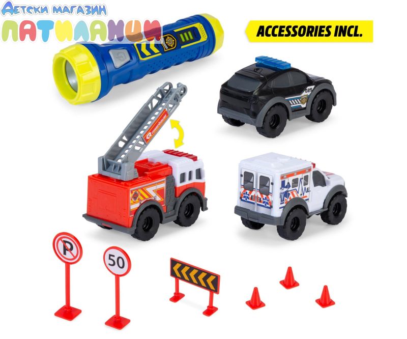 Dickie Toys - Комплект колички Micro SOS - 3 колички със свободен ход (полиция, пожарна и линейка) вкл. фенерче и аксесоари за игра, играчка количка за деца на 3 и повече години