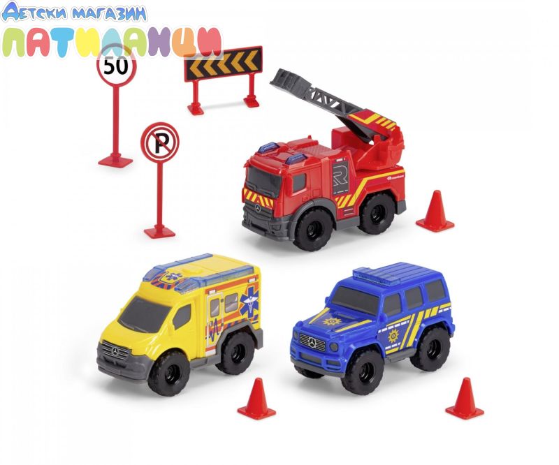 • 3 колички играчки - Комплектът за игра съдържа 3 официално лицензирани модела автомобили Mercedes-Benz с функция за свободно движение: пожарна кола Mercedes-Benz Antos, полицейска кола Mercedes-Benz G-Class и линейка Mercedes-Benz Sprinter.