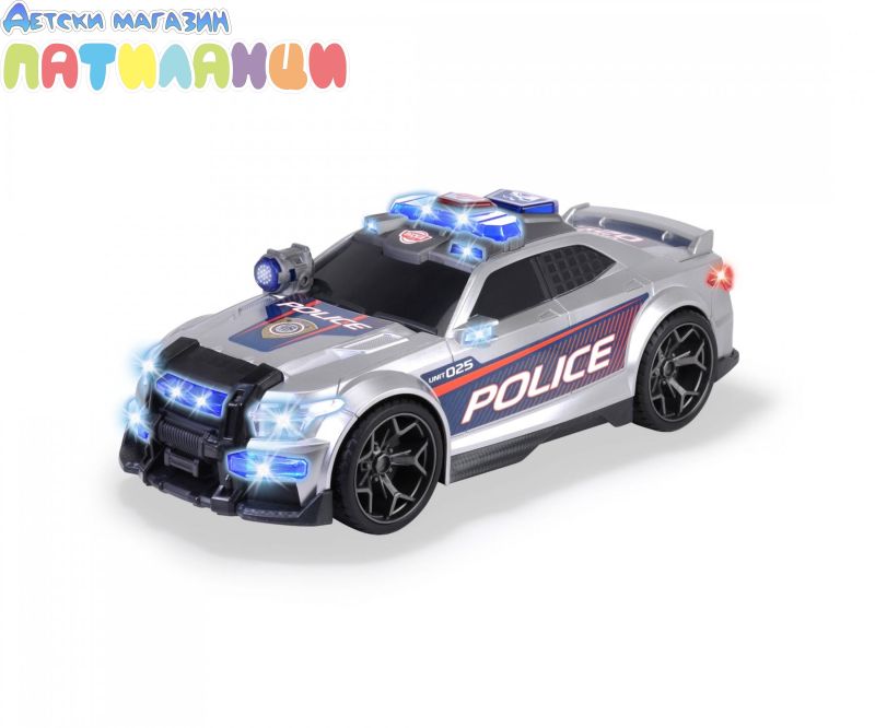 Тази моторизирана играчка полицейска кола гарантирано ще забавлява вашето мъниче. Тя разполага с вградена сирена и аварийни светлини за предупреждаване на близкия трафик, когато престъпници бягат. Просторното превозно средство (дължина: 33 см) се предлага и с големи фарове, за да се осигури добра видимост по време на нощни полицейски преследвания, както и с вграден прожектор. Всички необходими батерии (3x 1.5 V AA) са включени в продукта. Перфектната играчка за динамични полицейски преследвания!