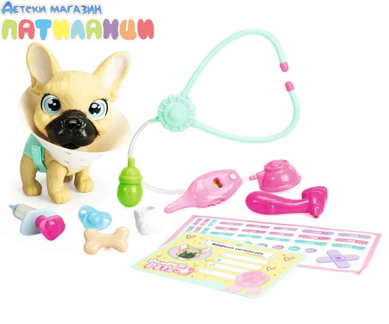 Всяко дете мечтае да има домашен любимец, с който да играе и за който да се грижи. Това очарователно малко куче Френски булдог ще донесе много емоции на своя нов собственик. Кучето е приятно на допир, леко и удобно за детските ръчички. Комплектът включва всички необходими ветеринарни инструменти, за да се погрижите за него, ако се нарани: стетоскоп с функция за сърцебиене, клиничен нашийник за кучета, термометър, спринцовка, УНГ инструмент, стикери, кокал и много други. Кученцето може да пие вода от собствената си бутилка и да пишка в пелената си. Когато се намокри, пелената променя цвета си. Кучето има подвижна глава и лапи, което ще ви осигури страхотно забавление. Както всички животни на Pamper Pets, това кученце се доставя с официален акт за раждане и ветеринарен паспорт. Докато играе, детето се учи да се грижи за животните. Серията Pamper Petz включва колекция от сладки животни с памперси, които искат да бъдат нахранени и обгрижвани, търсейки своя собственик, който да ги осинови, да им даде име и да ги дари с любов.