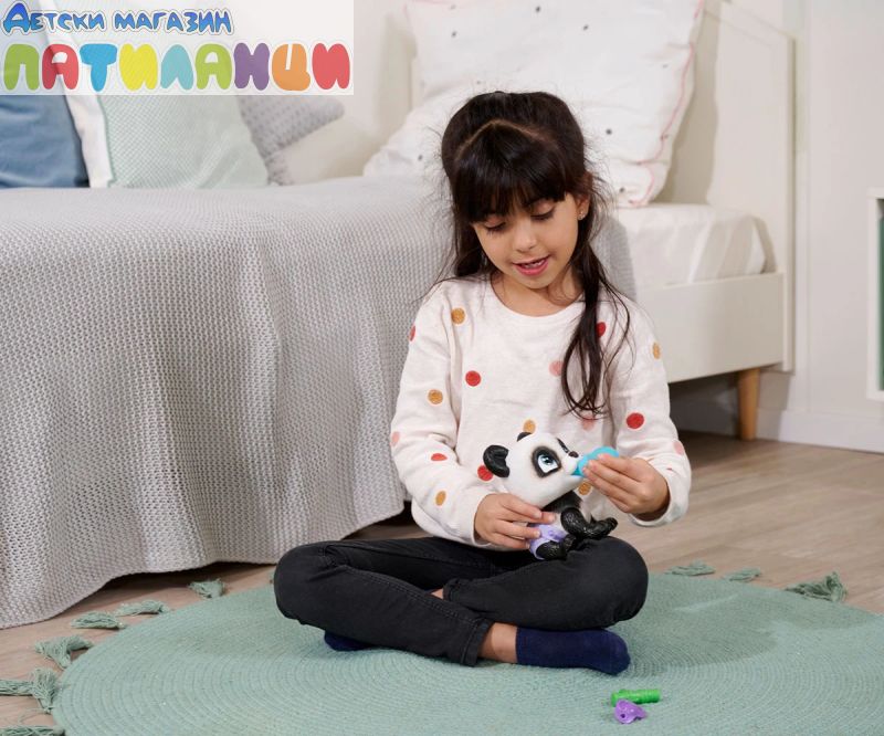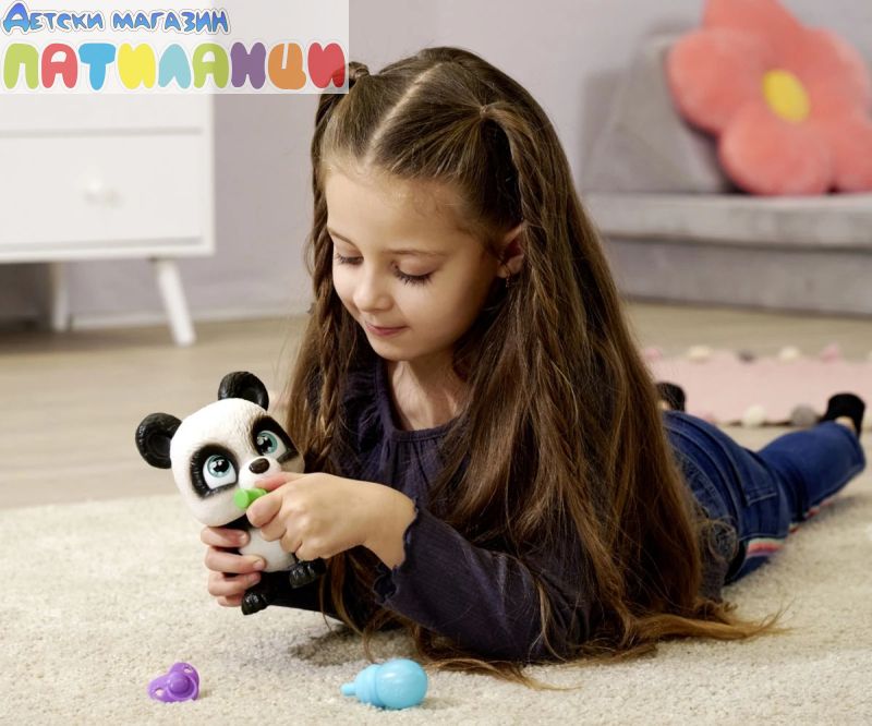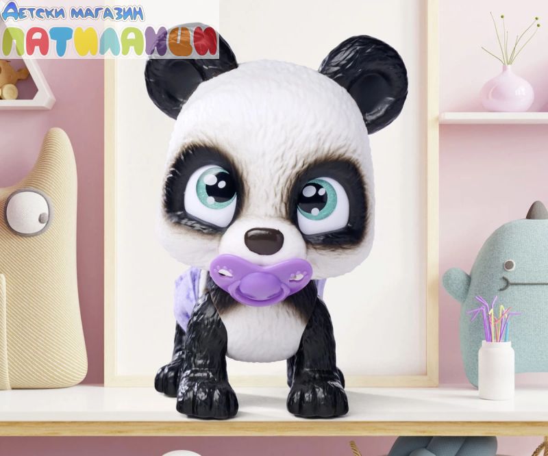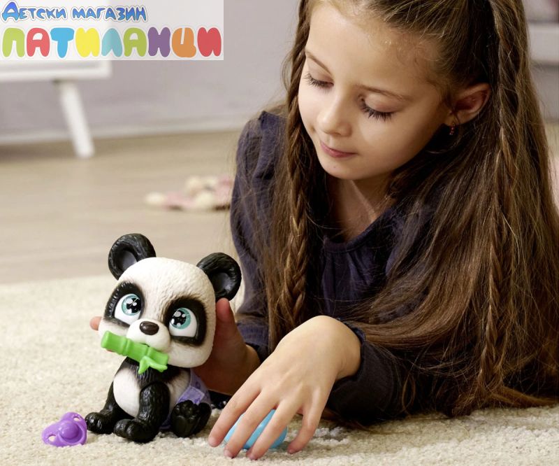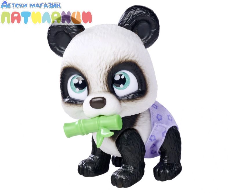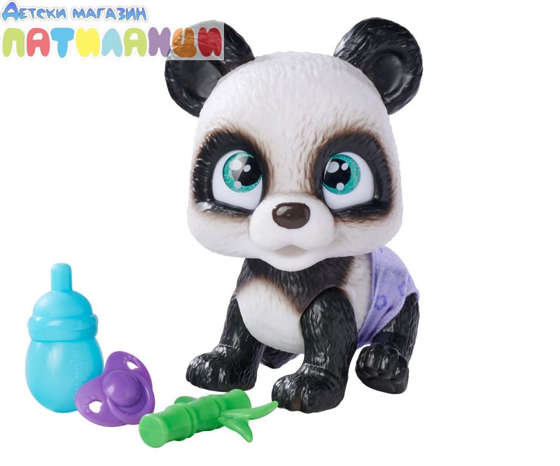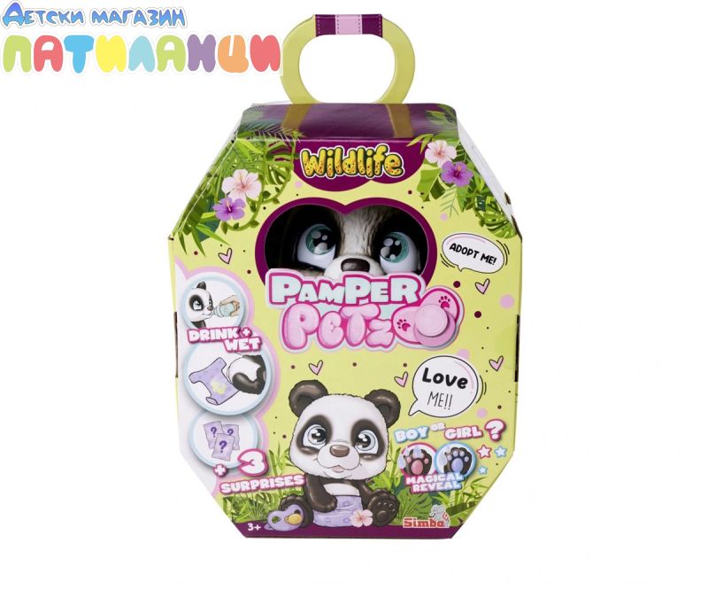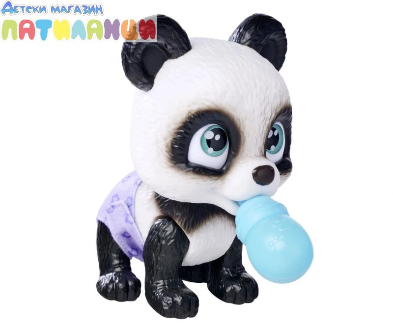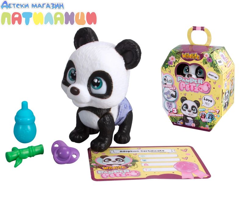 Серията Pamper Petz включва колекция от сладки животни с памперси, които искат да бъдат нахранени и обгрижвани, търсейки своя собственик, който да ги осинови, да им даде име и да ги дари с любов. Тази сладка черно-бяла панда с големи светлосини очи е в опаковка и чак след като бъде отворена, Вие ще разберете нейния пол. Тя може да пие вода от бутилката, след което ще се изпишка в пелената, която пожълтява, като истински домашен любимец. Комплектът включва и три изненади за грижа и хранене. Пандата може да държи аксесоари в устата си. Хартиената кутия с дръжка, в която е опакована пандата, може да се използва като преносима къщичка за домашен любимец. Това е идеален подарък за момчета и момичета. Допълнително комплектът включва сертификат за осиновяване на домашен любимец!