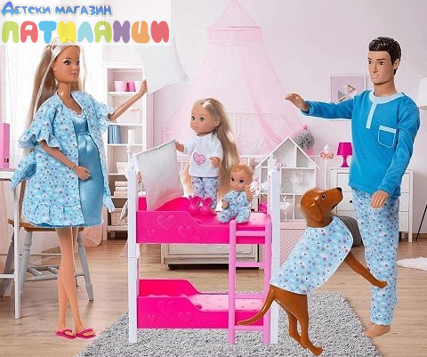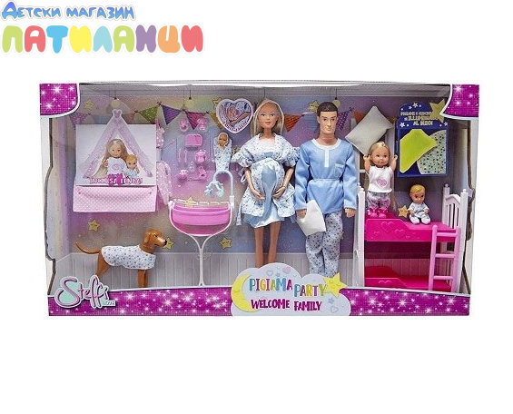Комплектът от Simba ще потопи децата в един топъл и уютен семеен свят, пълен с любов и грижа. Той включва куклите Стефи и Марк, двете им деца и тяхното куче – всички облечени в меки пижами, готови за весело пижамено парти у дома. Куклата Стефи е с бременно коремче, което може да се премахва, превръщайки играта в реалистично преживяване, докато децата очакват новия член на семейството. В комплекта ще откриете двуетажно легло за децата, бебешко креватче и множество аксесоари за грижа, които допринасят за автентично изживяване при игра.