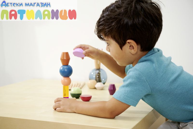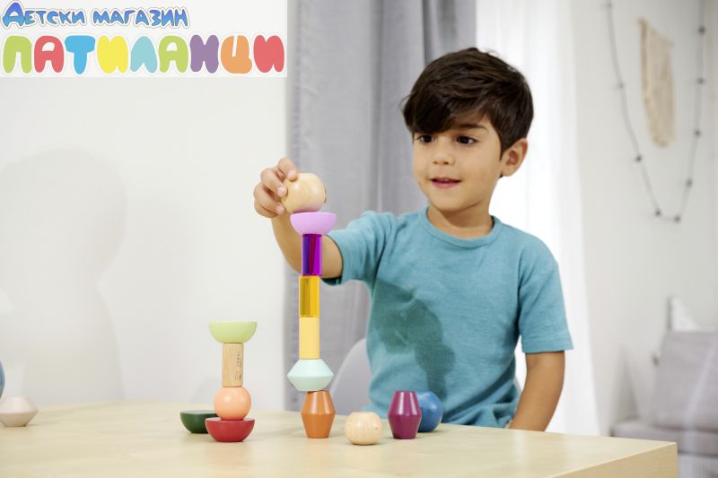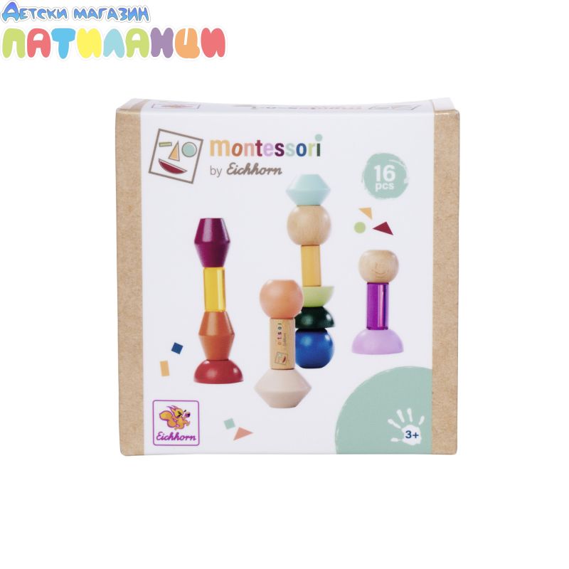 Тези специални геометрични строителни елементи изискват малко сръчност. 16-те цветни топчета за подреждане могат да се използват за изграждане на големи кули и форми. Децата ви ще се запознаят с 5 нови геометрични форми и ще харесат двете строителни блокчета от акрилно стъкло. Почти твърде добри, за да се приберат или преобърнат отново. Монтесори мънистата за подреждане са изработени от 100% FSC сертифицирана дървесина и са подходящи за деца на възраст над 3 години.