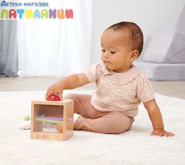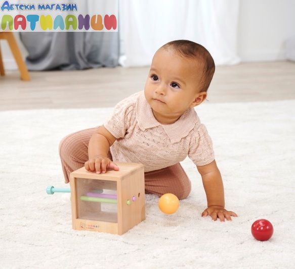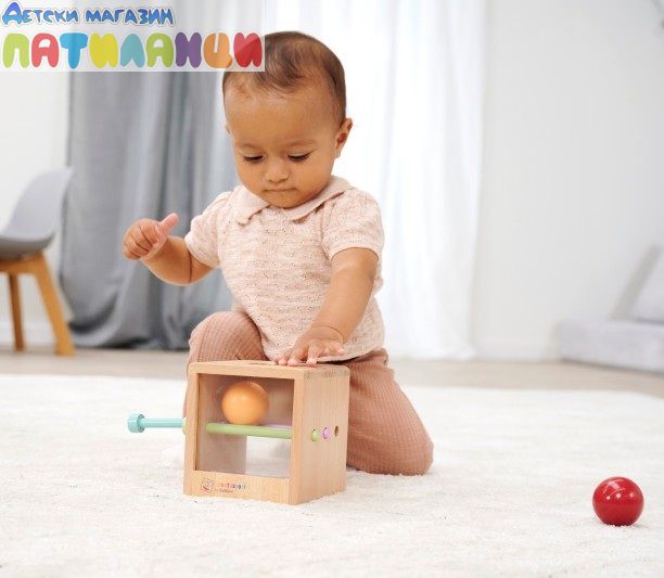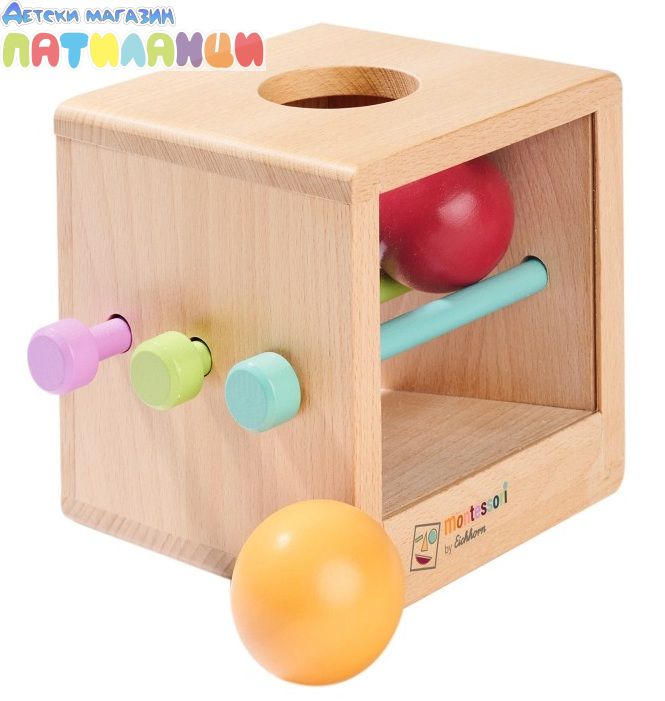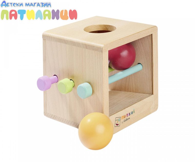 Комплектът се състои от дървена кутия с прозорец, 3 пръчки и 2 цветни дървени топчета за разнообразна игра.