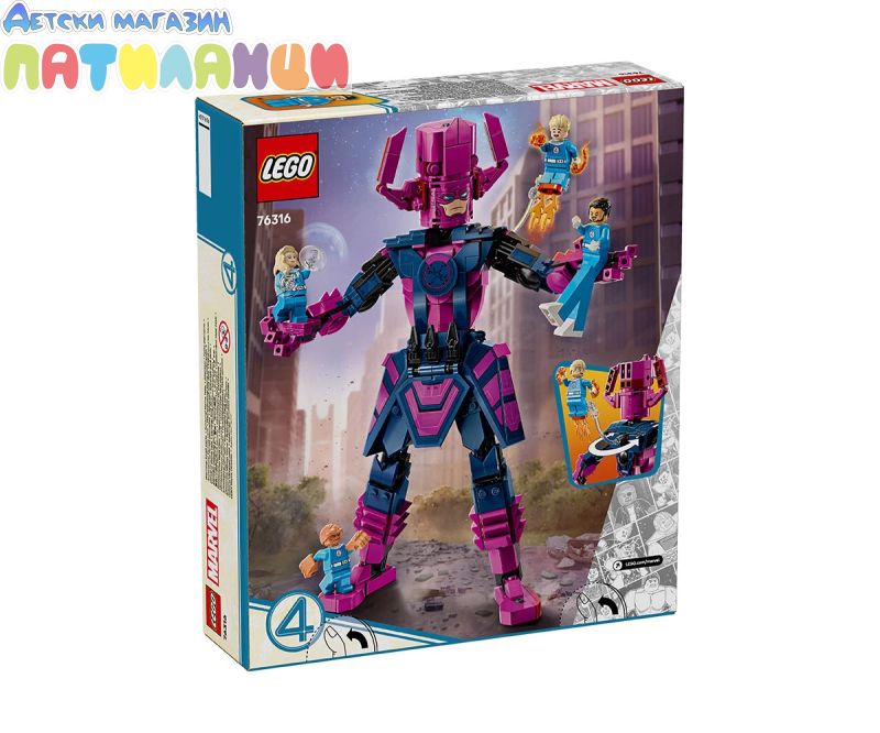 Феновете на The Fantastic Four: First Steps на Marvel Studios могат да пресъздадат екшъна от филма с LEGO® ǀ Marvel Фантастичната четворка срещу Галактус - фигура за конструиране (76316), първият по рода си комплект LEGO Fantastic Four! Този впечатляващ подарък за момчето и момичето на възраст над 9 години е комплект LEGO ǀ Marvel за деца, които обичат приключения със супергерои. Играта за построяване LEGO ǀ Marvel Fantastic Four включва 4 минифигурки: г-н Фантастичен с разтягащи се крака, Човекът-факла с два ръчни бластера и пламъци, прикрепени към краката му, плюс прозрачна опора, която му позволява да „лети“, Невидимата жена, която държи две силни щита, и Нещото с големите си силни ръце. Изцяло подвижната фигура за конструиране на Галактус, емблематичният злодей от филма, е с височина над 28 см. Тази подвижна фигура за конструиране предизвиква безкраен екшън, докато се биете със супергероите. За допълнително цифрово забавление строителите могат да компилират, да завъртят модели в 3D и да проследяват напредъка с помощта на забавното интуитивно приложение LEGO Builder. Комплектът съдържа 427 части.