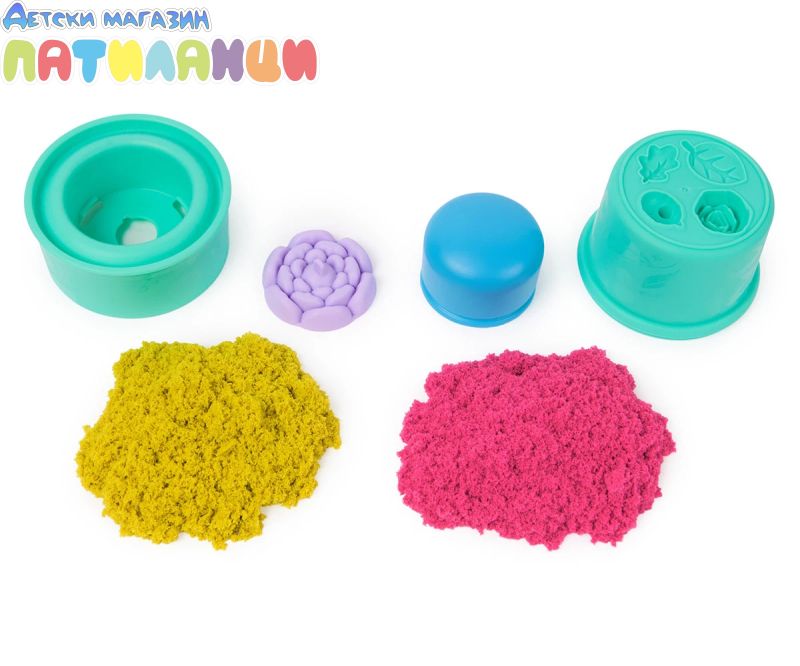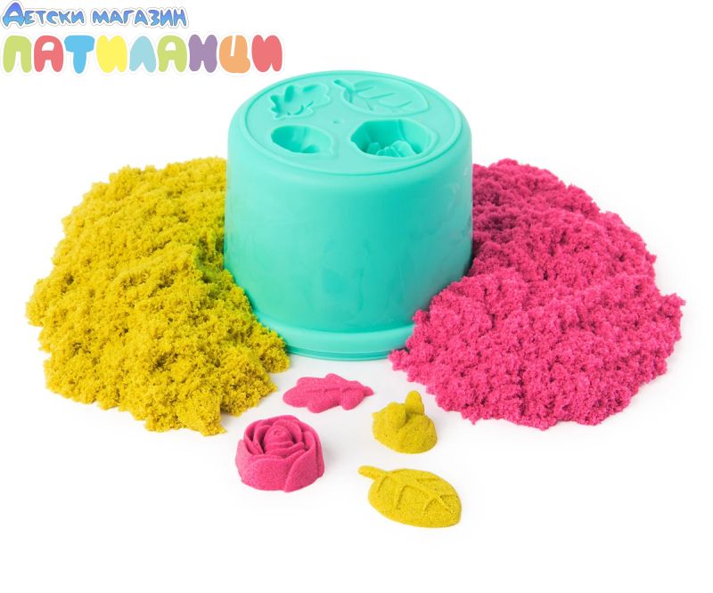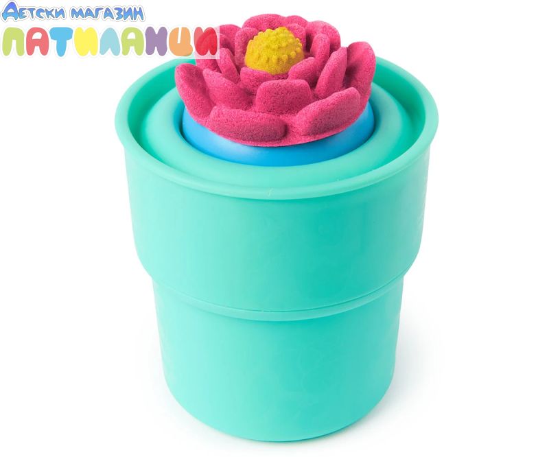 Притисни и наблюдавай как цветята оживяват! Комплектът включва 227 грама неоново розов и жълт Kinetic Sand, калъп за цветя и саксия с допълнителни форми на дъното;
