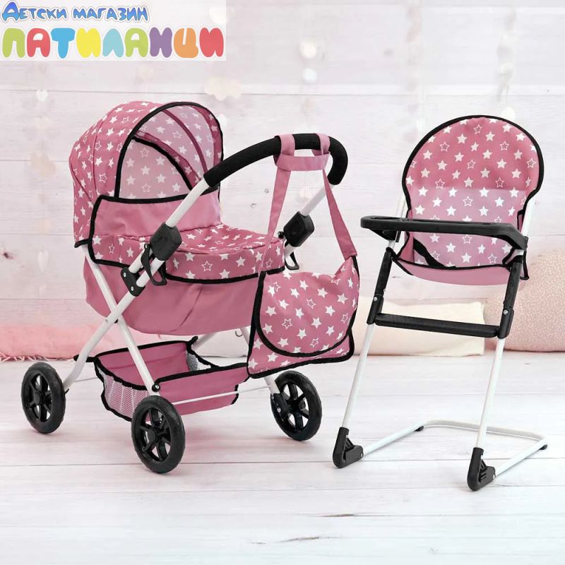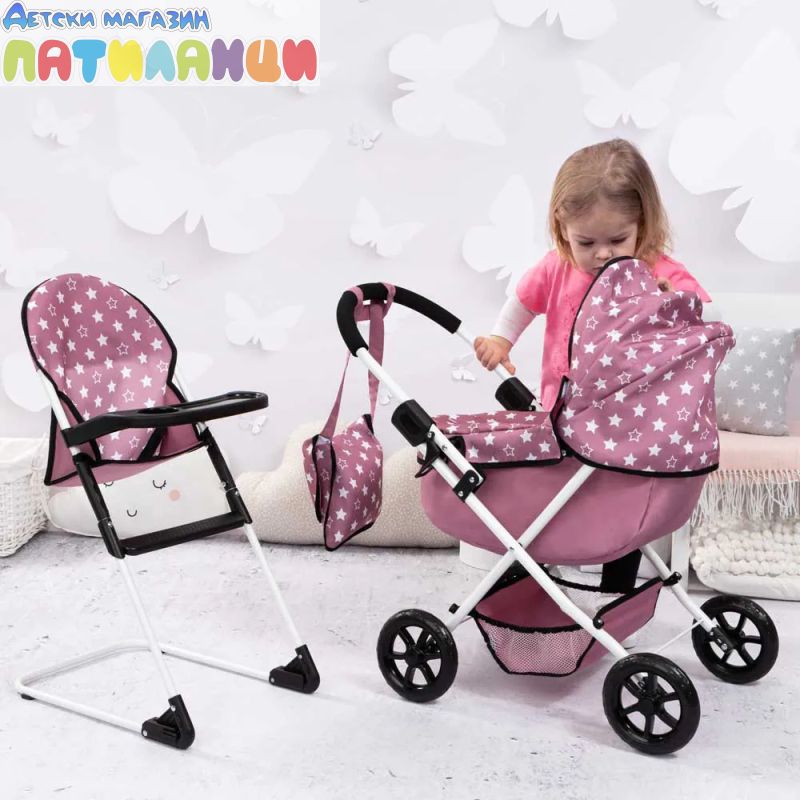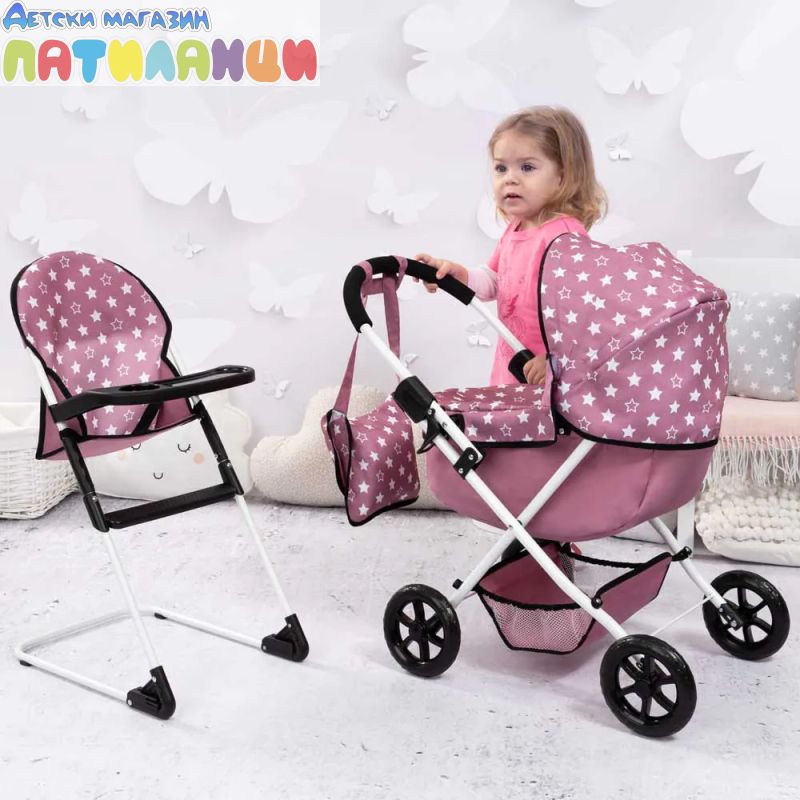 Комплектът с количка за кукли включва бебешка количка с чанта и столче за хранене на кукли.