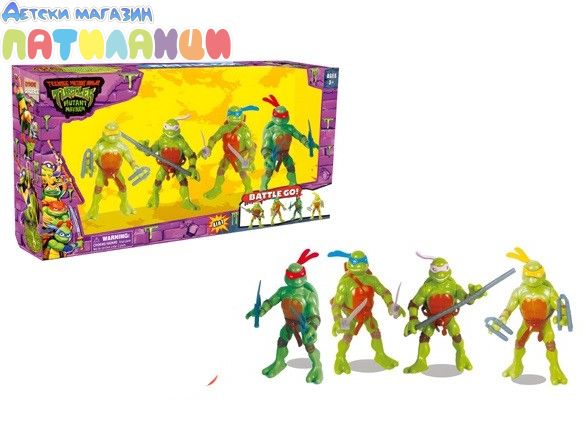 Този комплект от 4 мутантни костенурки нинджа включва Леонардо, Донатело, Микеланджело, Рафаело.
