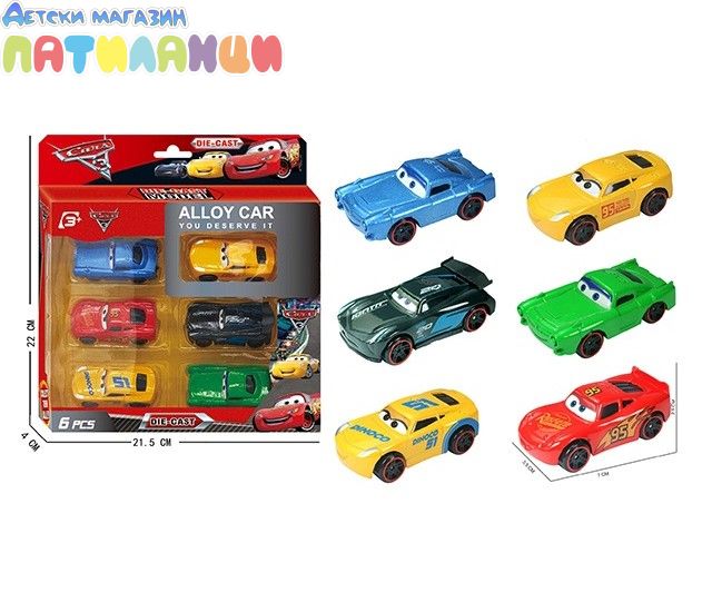 Комплектът включва разнообразие от цветни и детайлни колички, вдъхновени от героите на Дисни Пиксар.