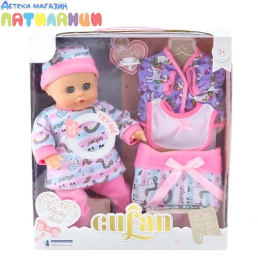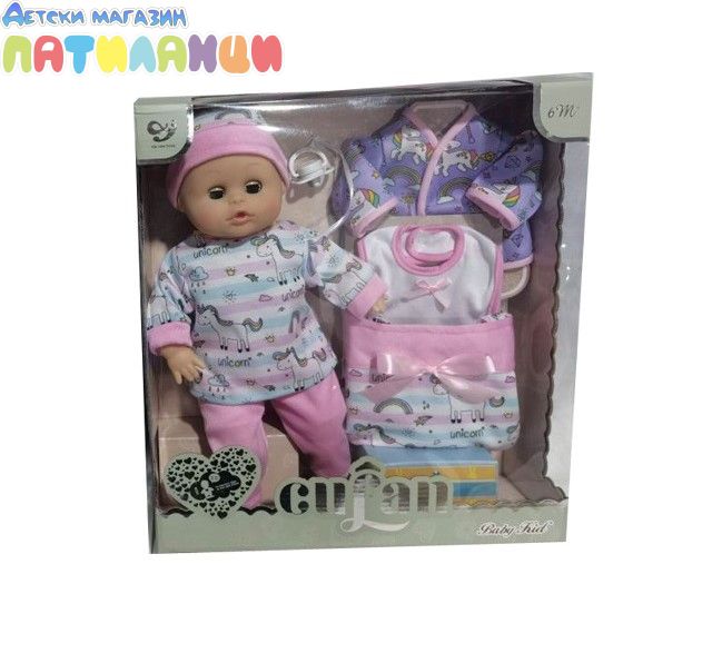 Куклата е облечена в красива розова пижама с флорални детайли и прекрасен еднорог в центъра. Бебето носи шапка. Комплектът включва биберон, лигавник и шал с тема еднорог. Цялото нещо пасва перфектно и изглежда абсолютно очарователно. Куклата има подвижни ръце, крака и глава. Може да се постави в седнало или легнало положение. Дрехите са подвижни, което позволява смяна на гардероба.