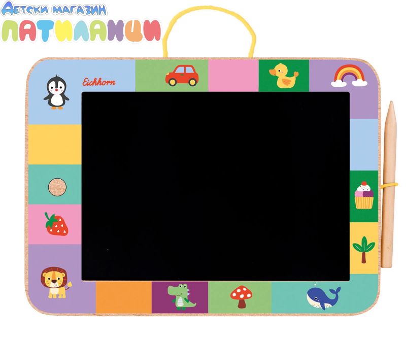 С красиво изработената дъска за рисуване на Eichhorn, специално създадена за малки творци над 3 години, децата могат да развият въображението си. Удобната за работа площ за рисуване с размер 22.5 x 16 см предлага достатъчно място за големи идеи и малки шедьоври. Ярките цветове и съществуващите символи по дъската се наслаждават на детската фантазия. Вграденият дървен молив винаги е под ръка, а благодарение на практичната дръжка за носене на дъската е идеален спътник – както у дома, така и в движение. С натискане на дървения бутон цветната рисунка се изчезва по магичен начин и може да се започне отново. Гарантирани със часове забавление и креативно учение! Дъската се предлага с включване на две батерии 1.5V/LR03.