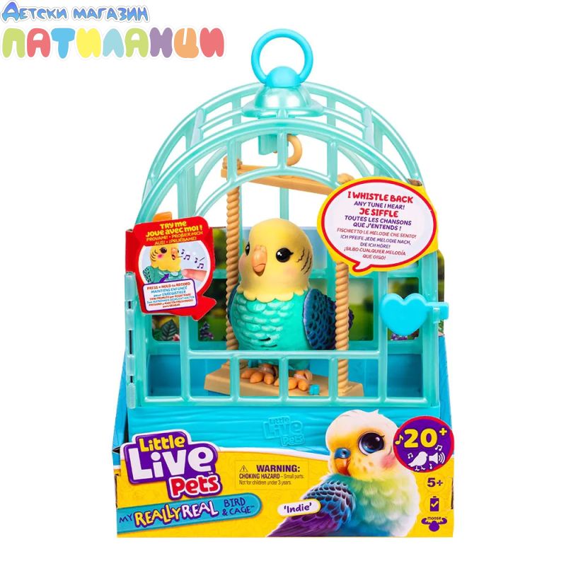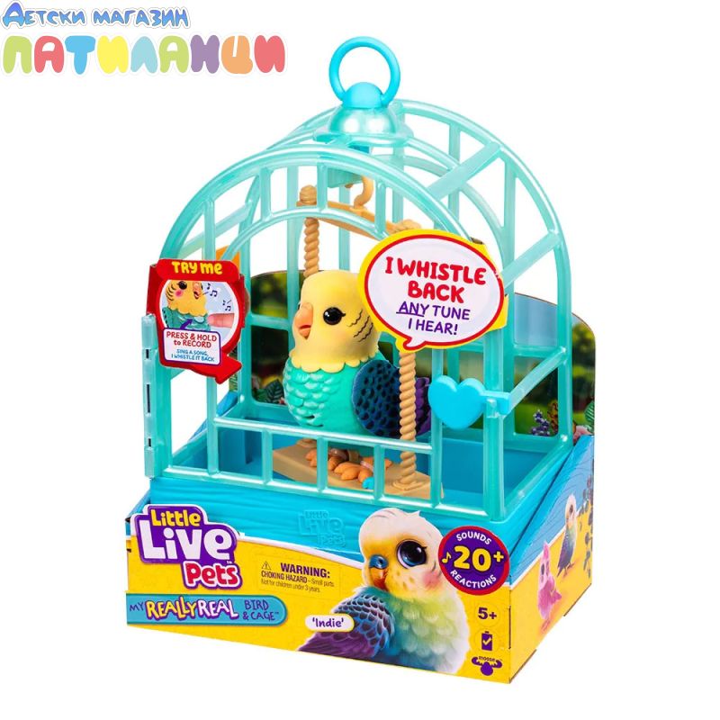 Тази играчка е толкова интерактивна – клюнът на птичката ти наистина се движи и тя обожава да свири сладки мелодии и да повтаря това, което казваш! Запиши гласа си и тя ще го повтори. Пей на птичката си и тя ще ти отговори със свирене в тон! С над 20 звука и реакции, галенето на птичката ти ще предизвика сладки звуци. Постави Инди в клетката ѝ и я вземи навсякъде с теб!