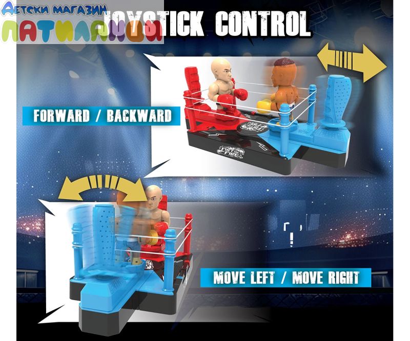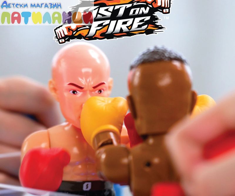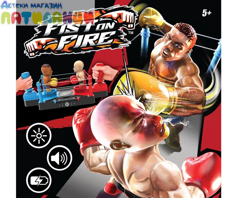 Представяме FIST ON FIRE – ексшън боксовият комплект, който носи тръпката от ринга право в ръцете ти! Този динамичен комплект включва 2 боксьорски фигурки, управлявани чрез джойстици, с които контролирате всеки удар и движение. Искаш да нанесеш нокаут? Просто премести джойстика наляво или надясно, за да атакуваш или да избегнеш удара! Трябва да се приближиш или отдръпнеш? Движи се напред или назад с лекарството. Напрежението се покачва с всеки успешен удар – лицето на опонента светва в червено! Нанесете 5 удара, и победата е вашата – противникът ще се срути драматично назад в поражението. За още по-вълнуващо изживяване, играта е подсилена с динамични звукови ефекти, които добавят реализъм и екшън без край. Стъпи на ринга с FIST ON FIRE – където бързите реакции и стратегията ще те превърнат в шампион!