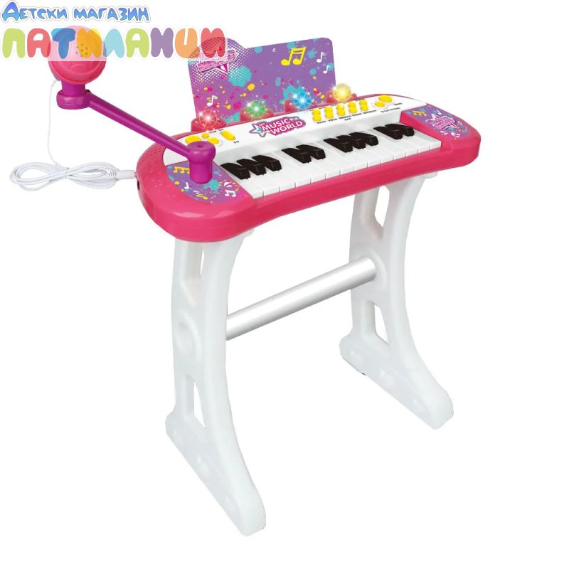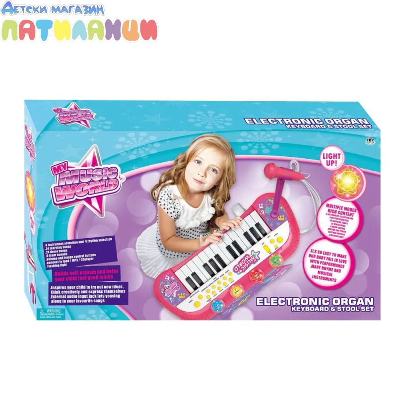 Детско електрическо пиано в розово и бяло със светлинни ефекти, стол и микрофон.