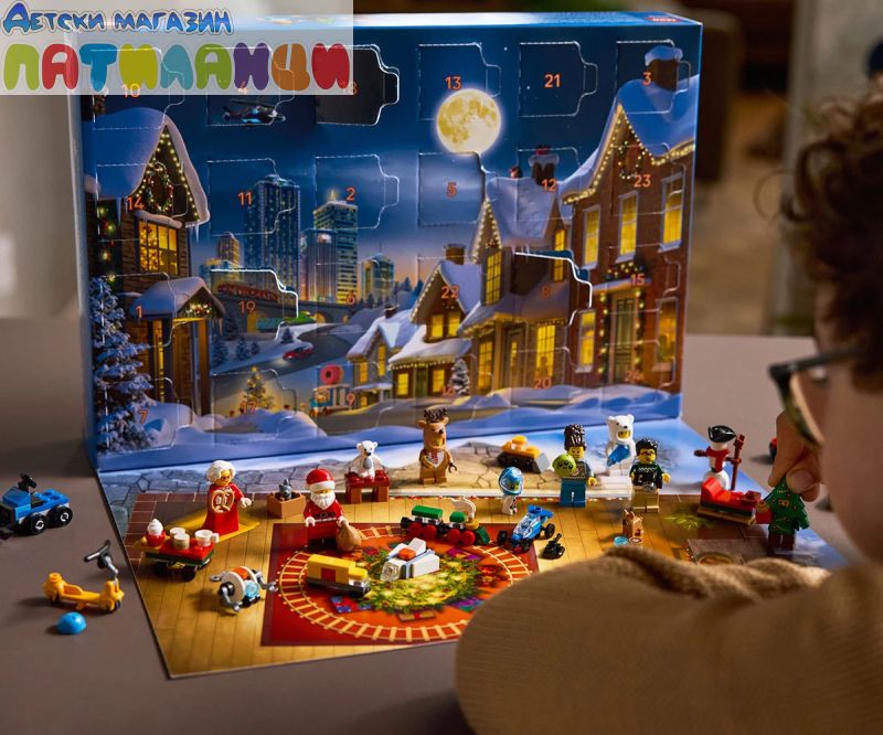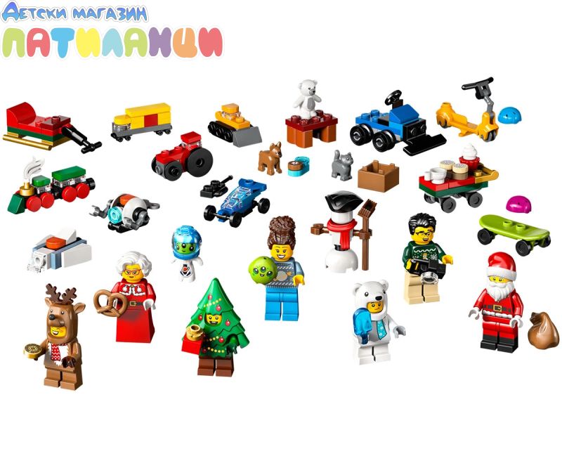 Подаръчен комплект с коледен календар с 24 изненади – включва минифигури на Дядо Коледа и г-жа Коледа, герои с костюми на полярна мечка, елен и празнично дърво, миниконструкции и забавни аксесоари;