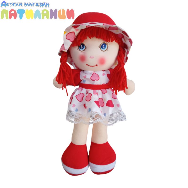 Мека и сладка парцалена кукла, облечена в красиви дрешки и страхотна шапка, а косата е прибрана в две плитки. Опаковка: плик;