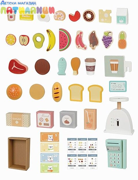 Дървен Супермаркет с всичко необходимо за един истински магазин. Комплектът включва голям щанд, везна, касов апарат, детски пари и различни видове хранителни продукти. Магазинът е на колелца и удобна дръжка за бутане, за да бъде лесно местен. Децата ще могат да се забавляват с часове, развивайки различни сценарий за игра. А ролевите игри от този тип помагат на децата да обогатят речника си, да развият въображението си креативността. Играчката е изработена от висококачествени дървени материали и нетоксични бои.