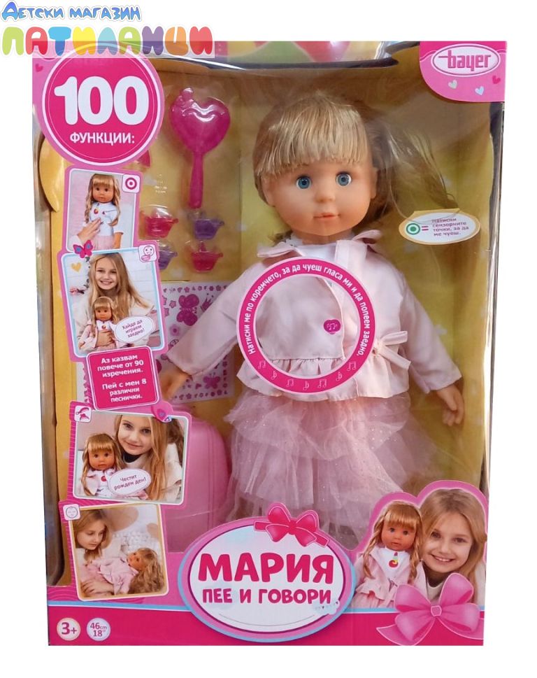 Мария е твоята нова най-добра приятелка! Тя е красива кукла с меко тяло, висока 46 см, със затварящи се очи и 100 функции. Тя може да каже 90 изречения, пее 8 песни и рецитира 2 стихотворения. И всичко това - на български! Мария иска да си играе, да пее или да рисува с теб. Тя носи красива мека розова рокля и сако, чорапи и обувки. В комплекта са включени фиби за коса, гребен, четка, куфар и стикери.
