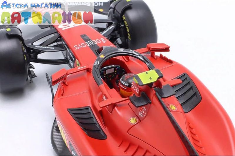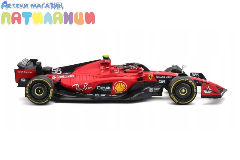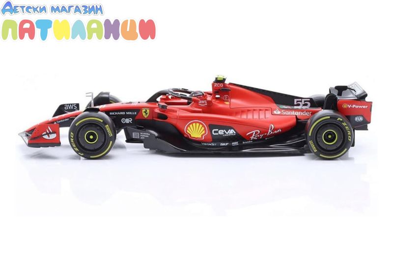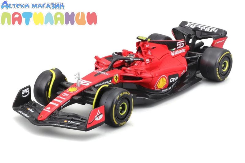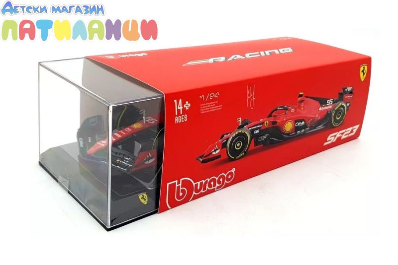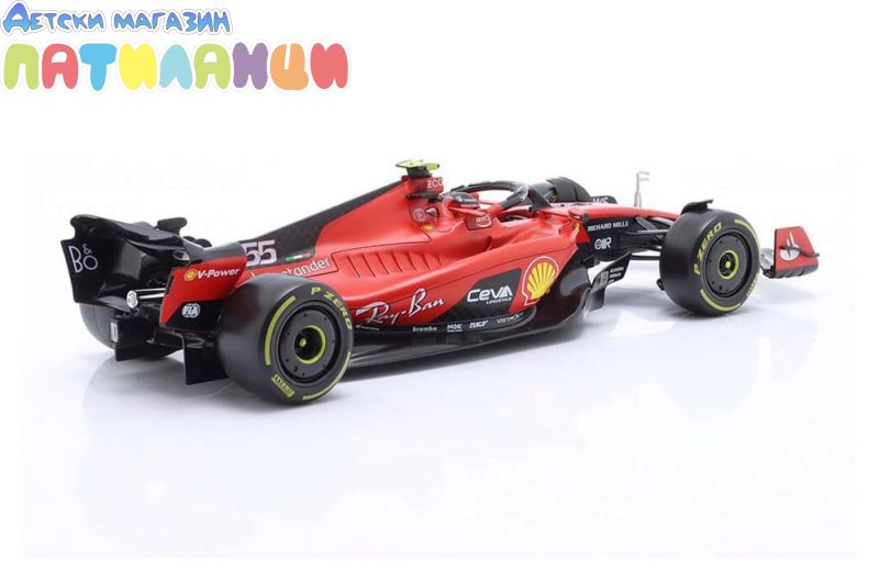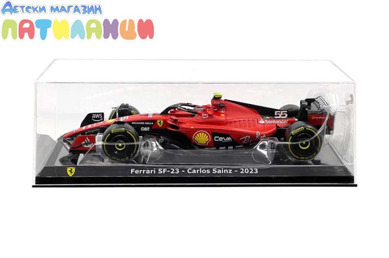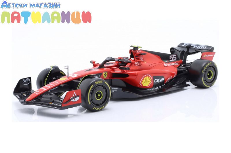 Металният модел Ferrari SF-23 Formula 1 (сезон 2023) в мащаб 1:24 от Bburago пресъздава болида на Scuderia Ferrari с номер #55, управляван от Carlos Sainz. Моделът включва и фигурка на пилота, което допринася за още по-реалистично и автентично изживяване.