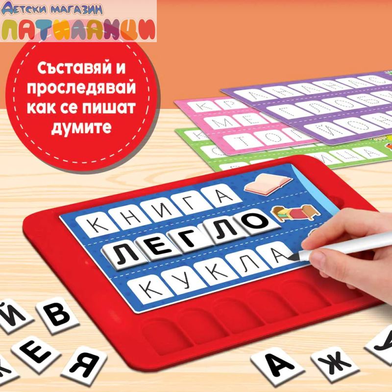 Със специалната подложка за писане детето съставя думички с включените букви, проследява писането на буквите и преписва думите със специалната изтриваема писалка.