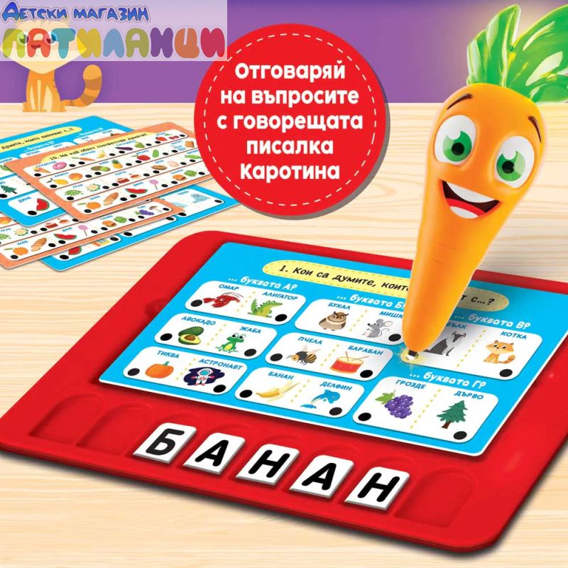 Освен това – много интерактивни карти за научаване на азбуката и за откриване на нови думи в компанията на интерактивната, светеща писалка - Каротина!