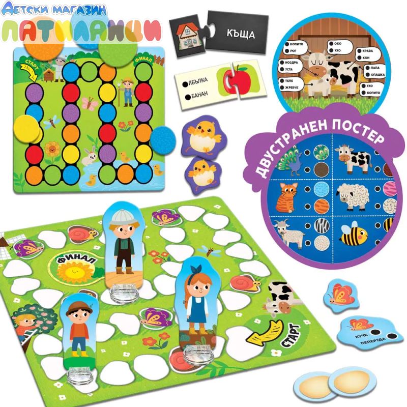 Децата разполагат с Интерактивна и Светеща Каротина и много здрав картонен материал с картинки на животни, храни и предмети от света на фермата.