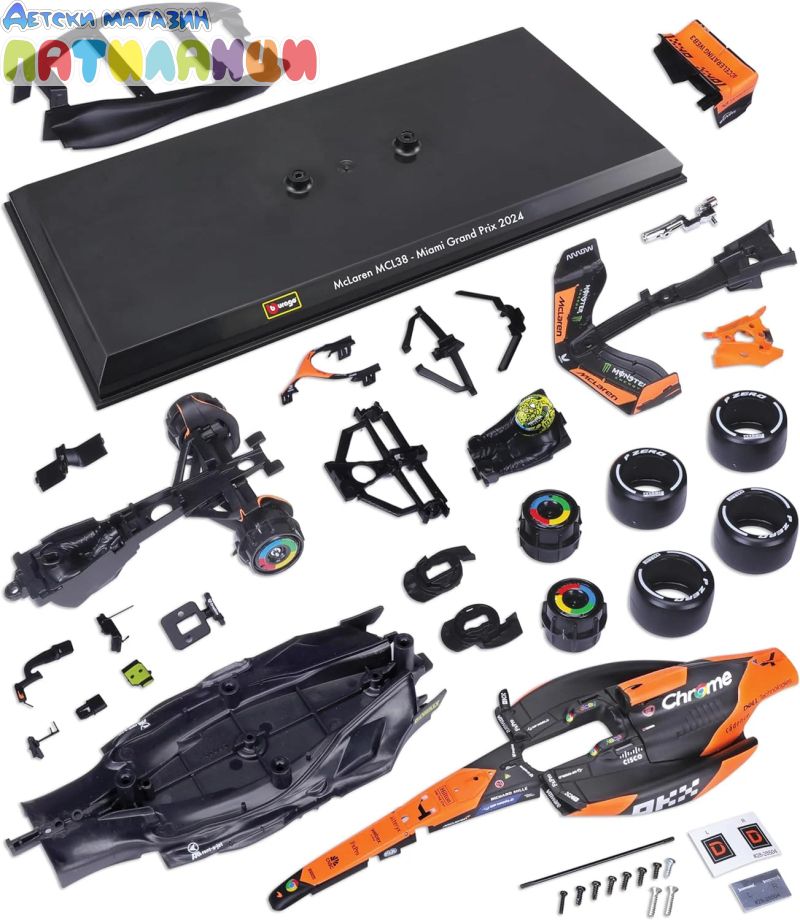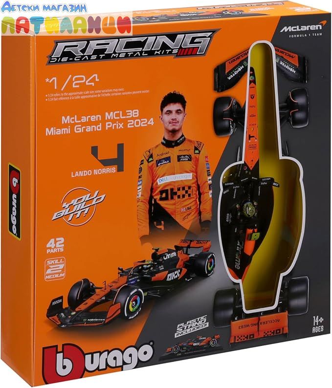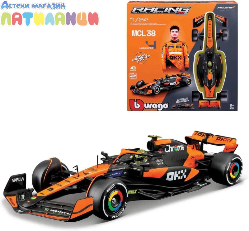 Метален модел за сглобяване от Bburago, пресъздаващ болида McLaren MCL38 с номер #4, управляван от Ландо Норис. Моделът е създаден с внимание към детайла и предлага автентичен дизайн, вдъхновен от сезон 2024 на Formula 1.