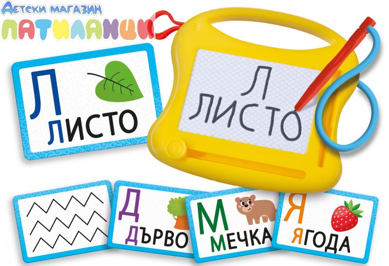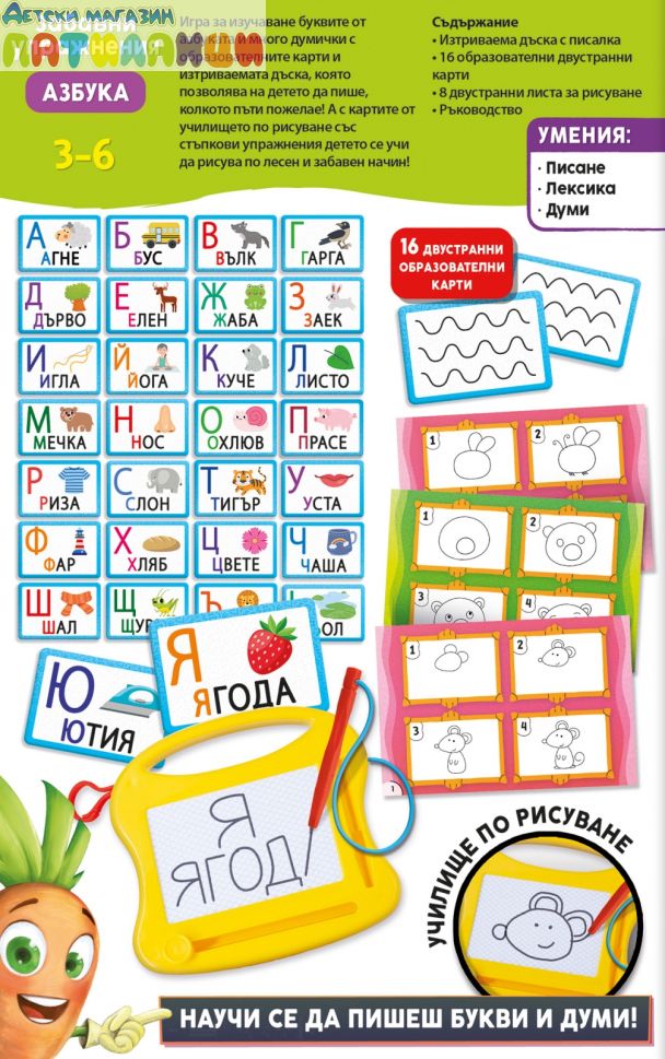 Игра за изучаване буквите от азбуката и много думички с образователните карти и изтриваемата дъска, която позволява на детето да пише, колкото пъти пожелае! А с картите от училището по рисуване със стъпкови упражнения детето се учи да рисува по лесен и забавен начин!