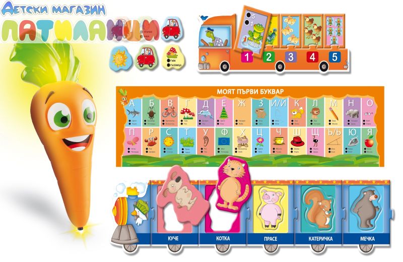 Вълшебната игра с Каротина е прекрасен начин да се играе и учи едновременно. Яркият игрален комплект ще Ви пренесе в интересния свят на Каротина. На влака се возят животни, а на автобуса – цифри. Мемо картите и плакатът с азбуката спомагат за веселото и неусетно упражняване на паметта и осъществяване на първи стъпки в изучаване на буквите.